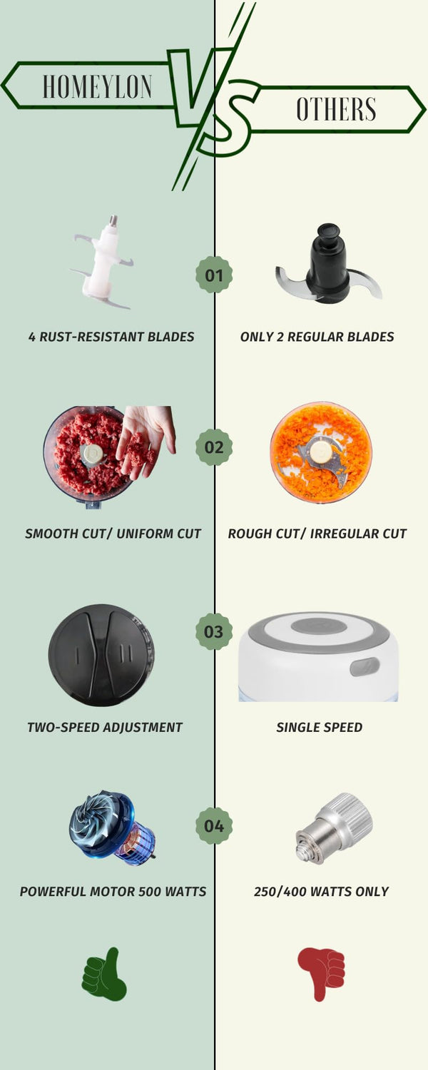 - Super Fast Food Processor: This 500W food chopper handles processing in just 6-10 seconds, offering a swift and convenient kitchen experience. The electric chopper is ideal for fast meat and vegetable prep.