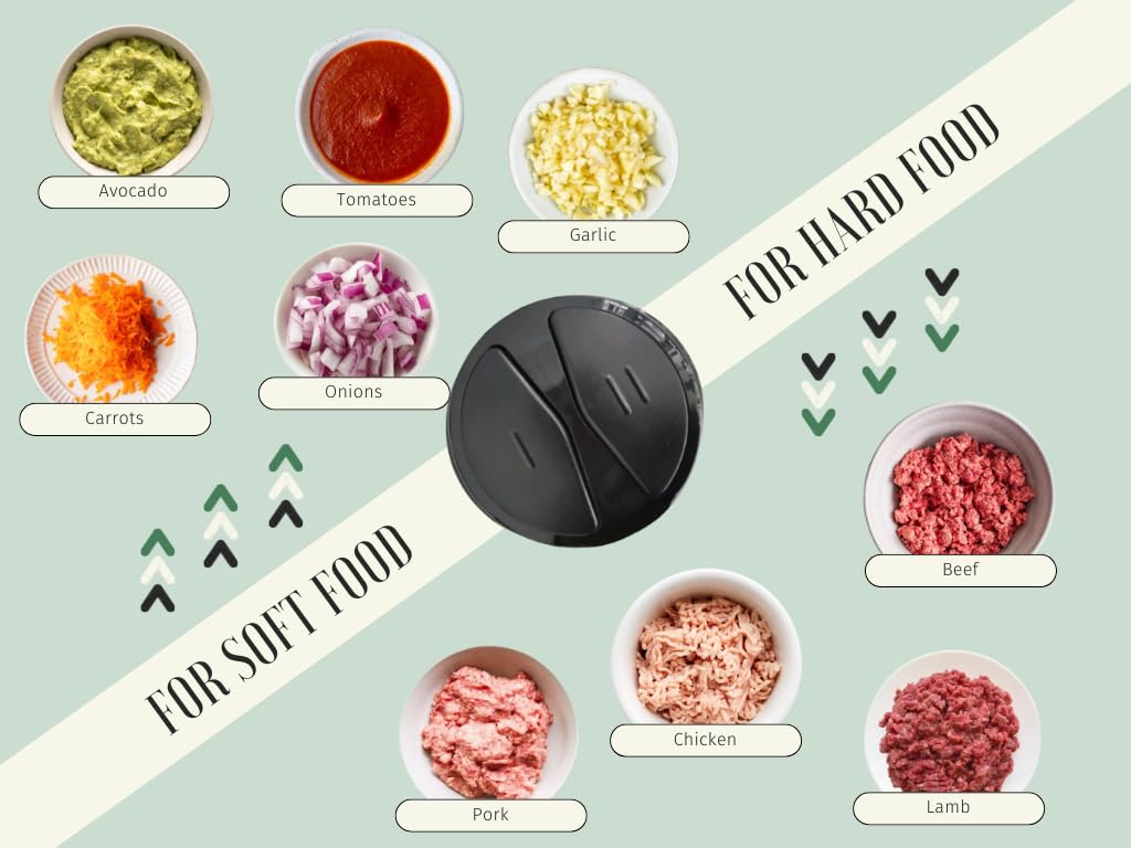 - Versatile Speed Adjustment: With two speeds, this small food chopper easily adapts to various ingredients. SpeedⅠ is perfect for softer items like onion and garlic, while SpeedⅡ tackles tougher foods like meat, ice, and baby food. Selectable speed control ensures smooth processing every time.
