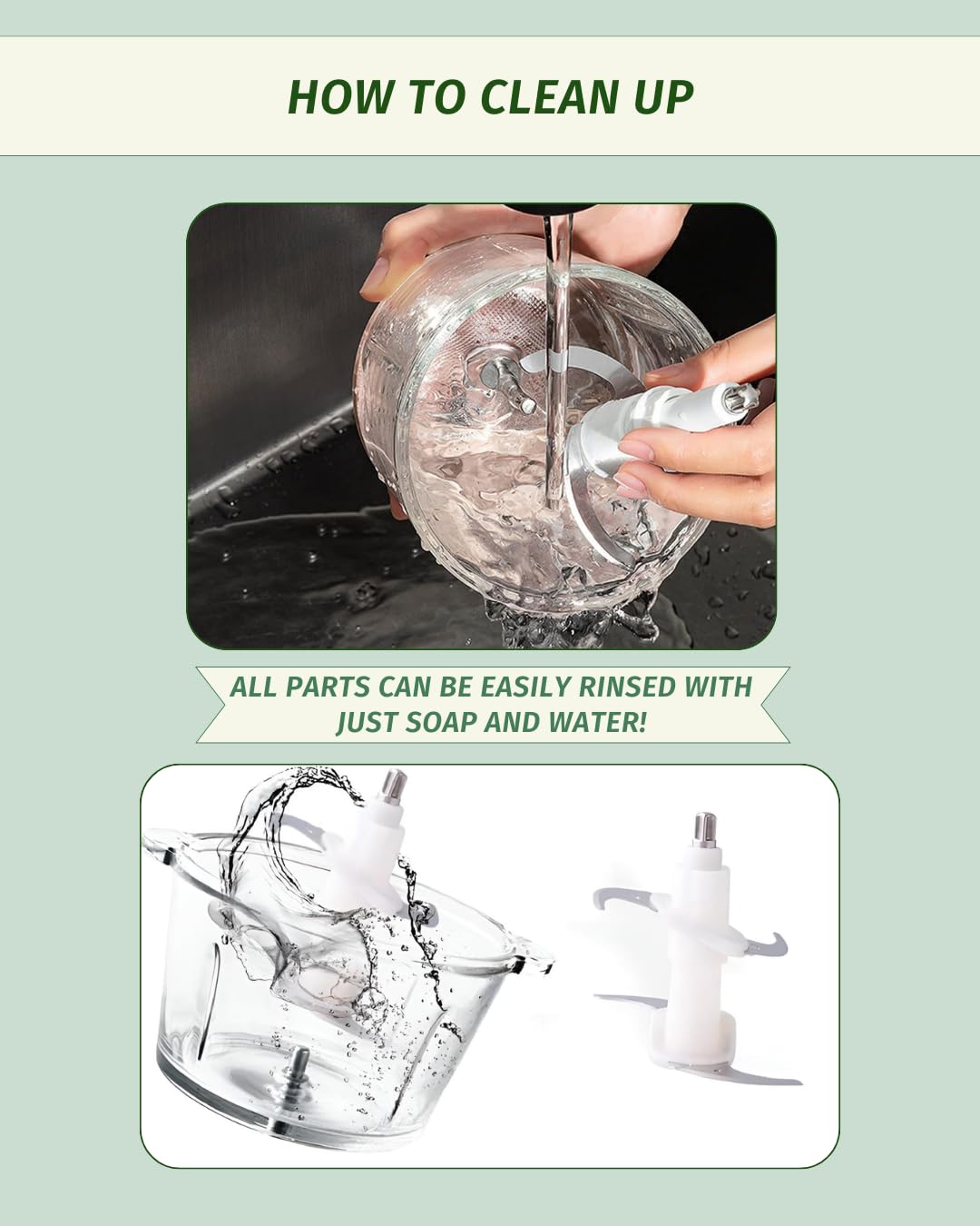 - Easy Cleaning & Low Noise: This food processor small is dishwasher-safe (excluding motor), with a non-slip base and low-noise design for user comfort. Included scraper and lid help with easy removal and odor protection.