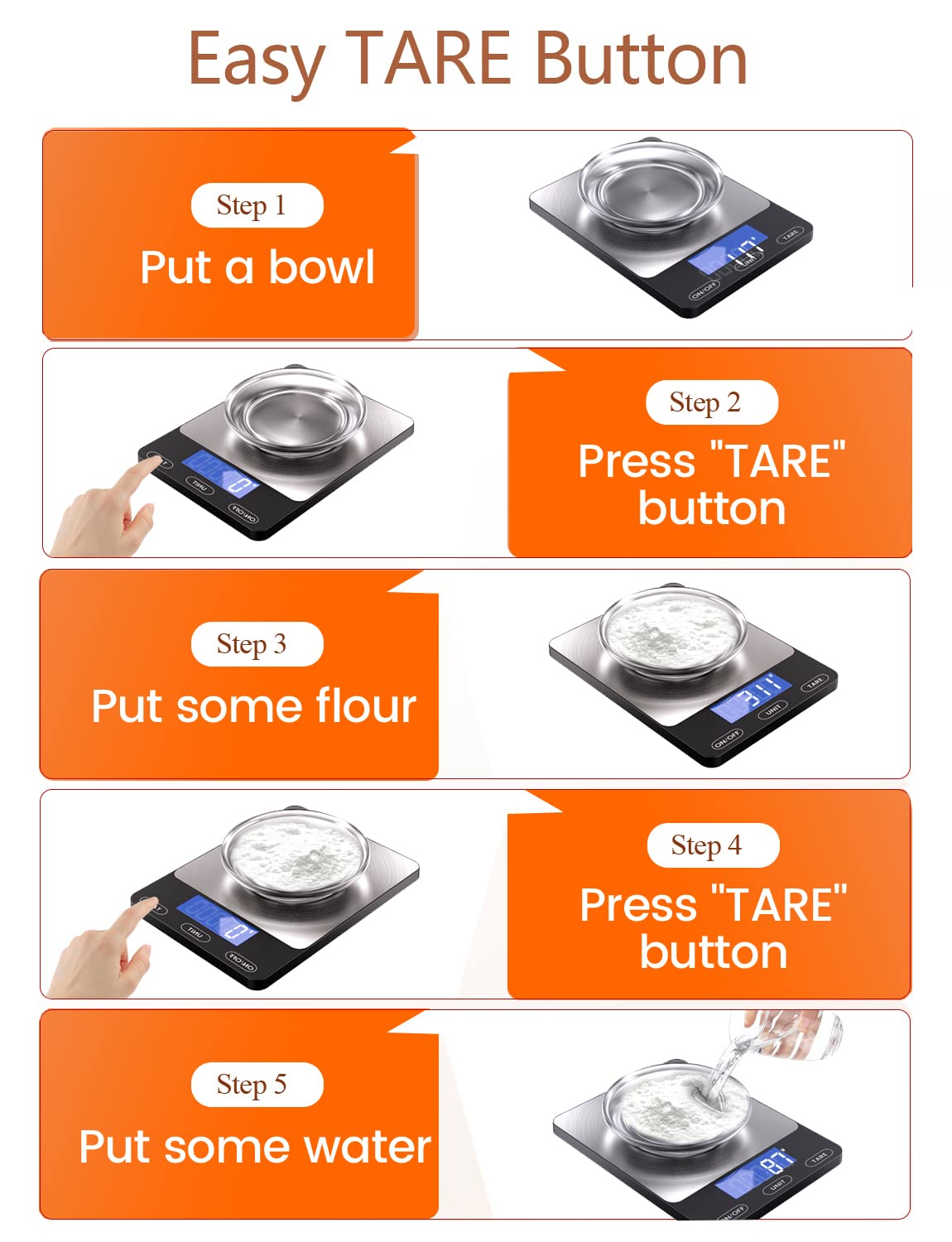 - 【Weight Control Scale -Easy Tare】 The Tare button allows you to subtract the weight of mug, plate, or different sized bowl, making it easy to achieve accurate readouts of nuts, grains, powder, fruit, milk and more food.