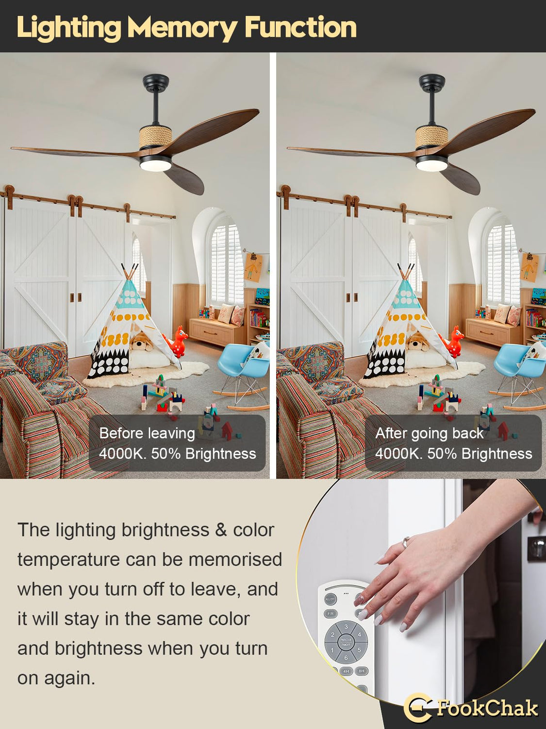 - ◆Dimmable Ceiling Fan Light - FookChak LED wood ceiling fan with light, set it up with remote control, the fan can stepless dimming from 10% to 100%