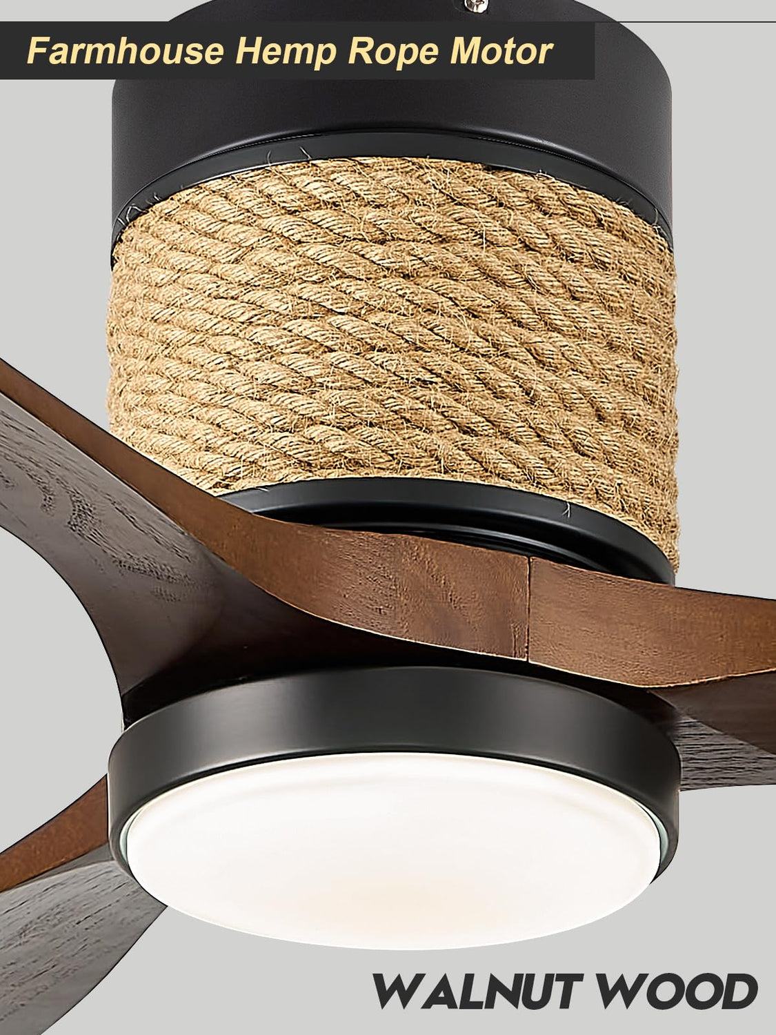 FookChak 60in Dimmable Black Ceiling Fan Light with Remote Control 3 Blade Hemp Rope Farmhouse Ceiling Fan with Light Walnut Wood LED Ceiling Fan Outdoor for Patio Kitchen Bedroom Living Room