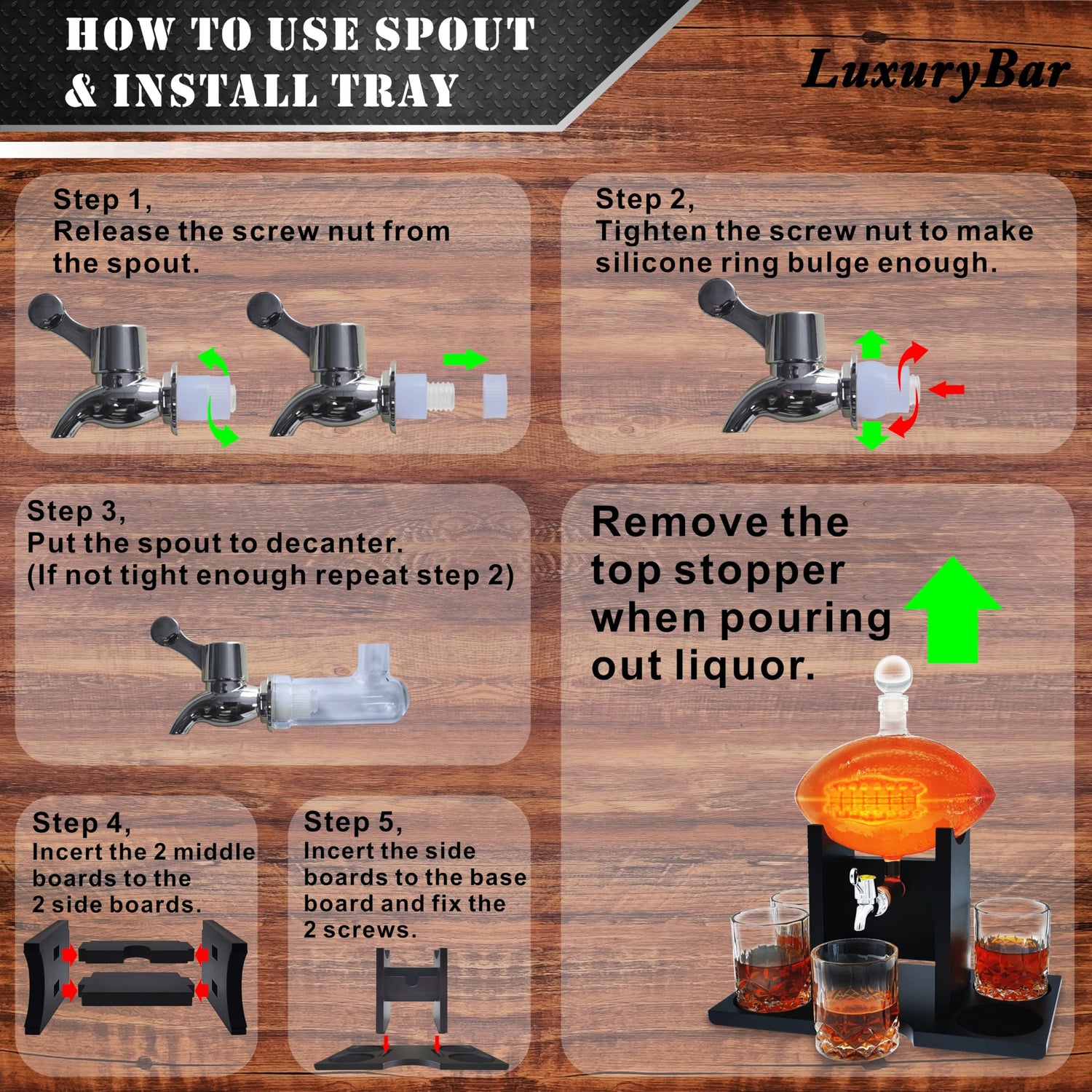 - FOOTBALL DESIGN FOR FOOTBALL LOVER, 47 OZ FOR 2 BOTTLES : ---- Football 12pack whiskey decanter set with glasses for football lovers. , 47 oz big capacity liquor decanter whiskey set for 2 bottles of whiskey. LuxuryBar whiskey glass set with liquor dispenser for home bar is the best whiskey gifts for men, bourbon gifts for men, man cave decor, dad birthday gifts for men unique, christmas gift for dad and fathers day gift ideas