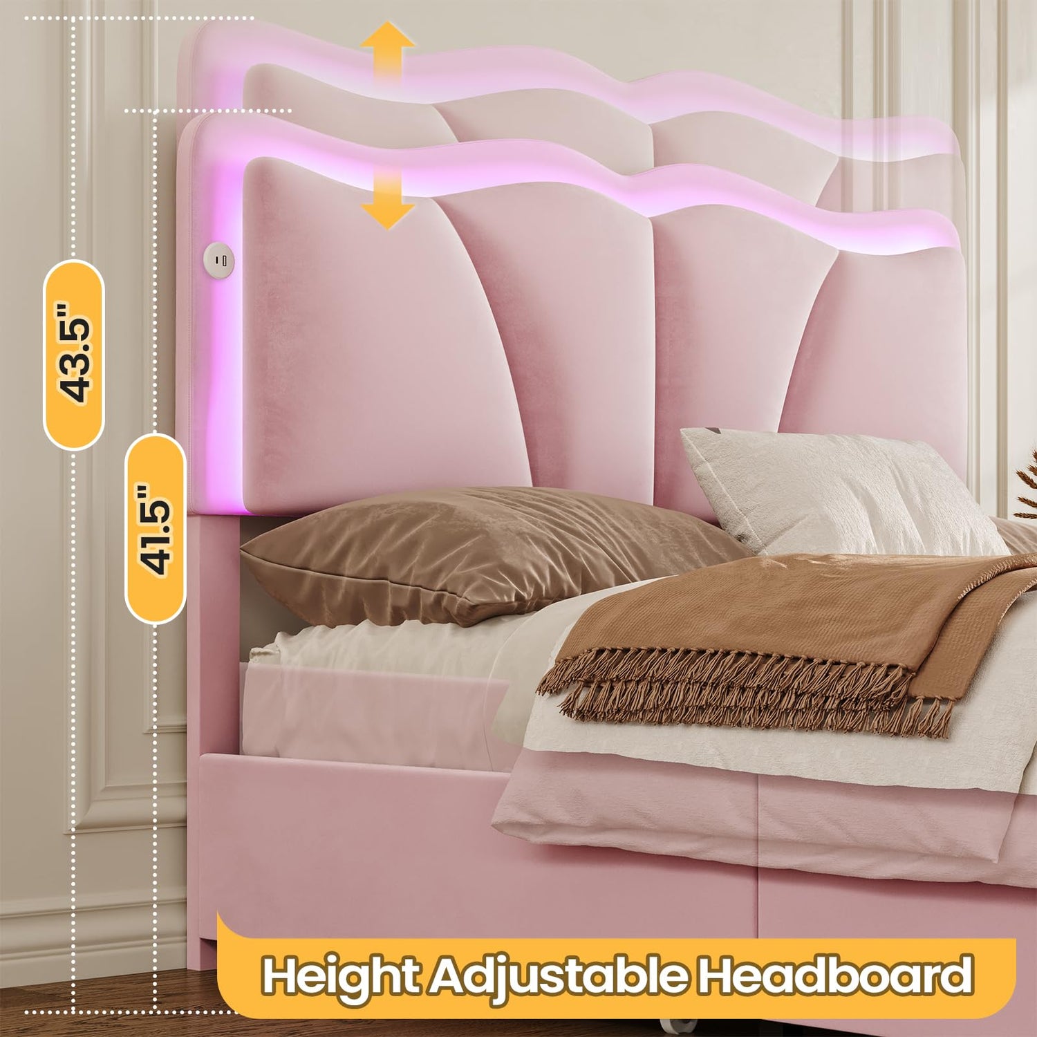 FORABAMB Full Size Bed Frame with 4 Drawers, Upholstered LED Bed Frame with Adjustable Flowers Headboard, Platform Bed Frame Full Size with Wooden Slats Support, No Box Spring Needed, Pink