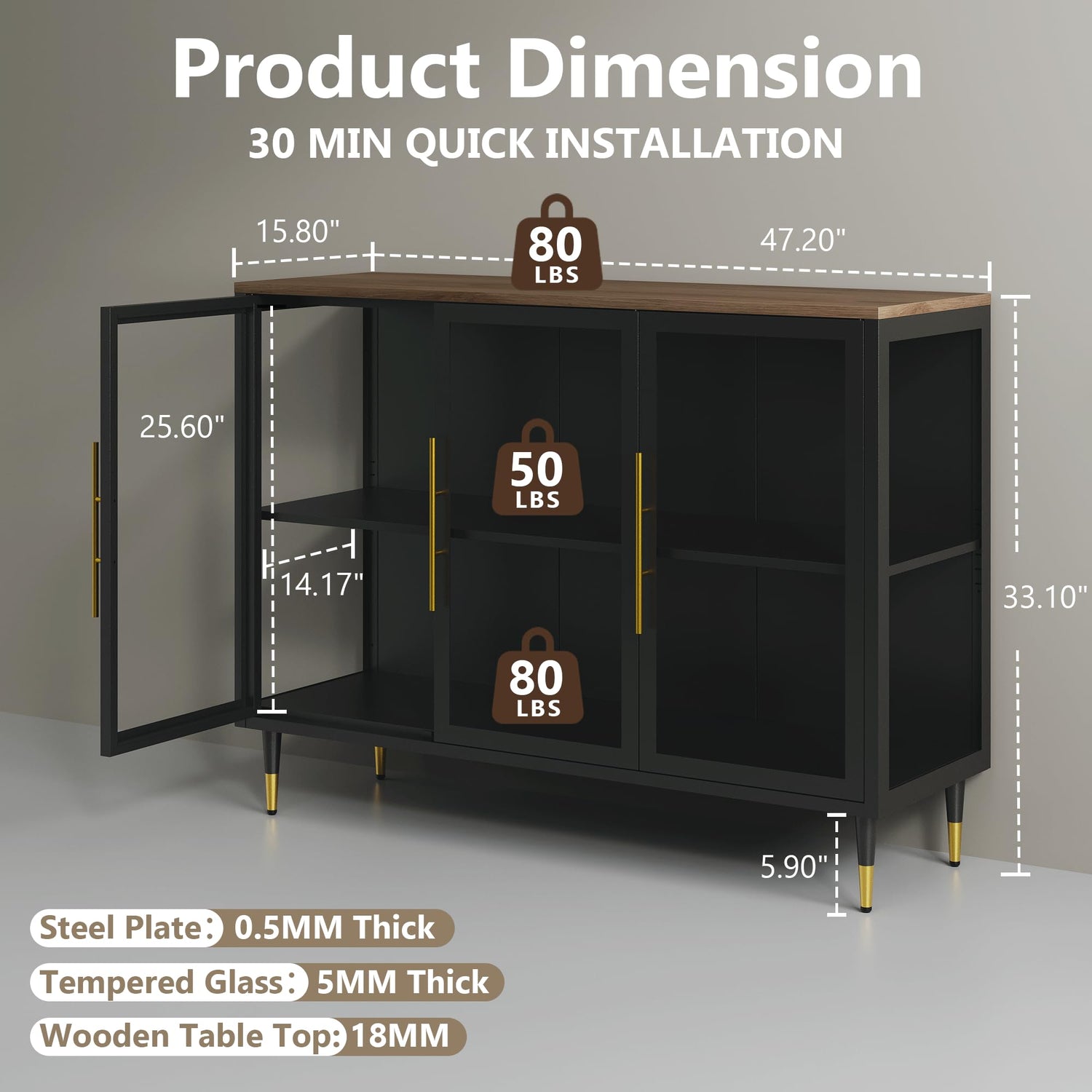 - 【Heavy-Duty & Customizable Shelving】Foreate black buffet cabinet with storage combines strength and adaptability with an 18MM thickened wood top and 0.5MM thick steel frame, allowing 80 lbs/shelf load capacity. The steel frame resists warping, moisture, and odors—perfect for humid climates or busy homes. Adjustable shelves adapt to items of any size for flexible storage.