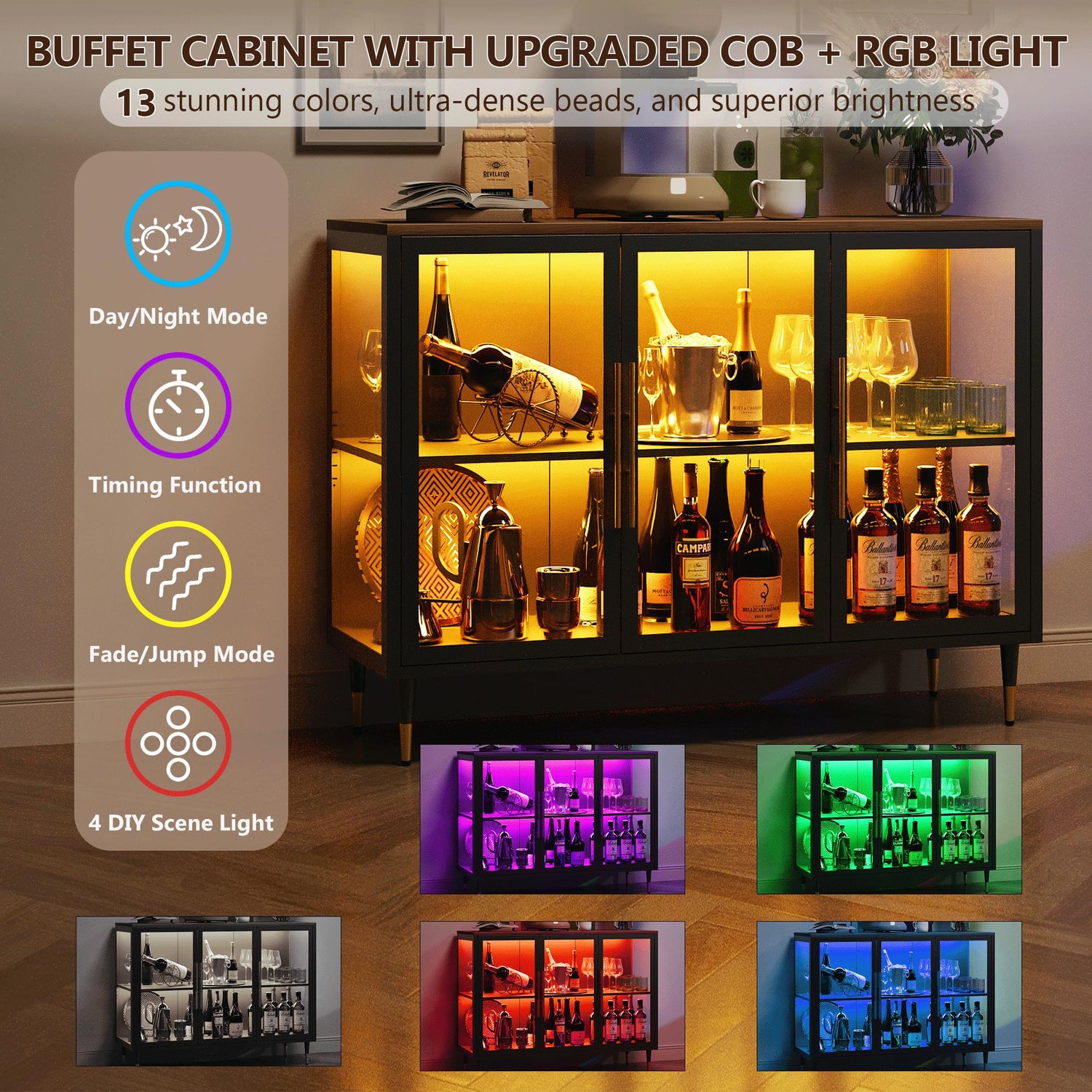 - 【Customizable 13-Color Lighting: Ultra-Bright & Dimmable】Foreate buffet cabinet with glass doors features advanced COB+RGB dual-light technology for 30% brighter and more vibrant illumination than standard LED light. Remotely switch between 13 colors, adjust brightness, and cycle through light modes—ideal for setting the mood, from cozy dinners to lively parties.