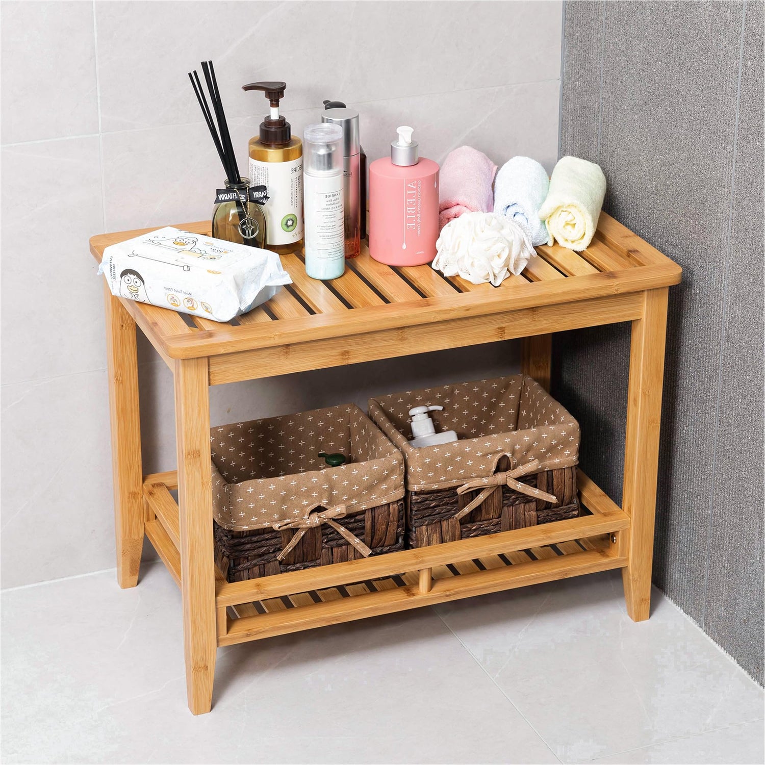 Forevich Bamboo Shower Bench Stool Bathroom Shower Chair Seat with Storage Shelf Spa Bath Foot Rest for Insider Shower Bathtub Elderly and Disabled Natural