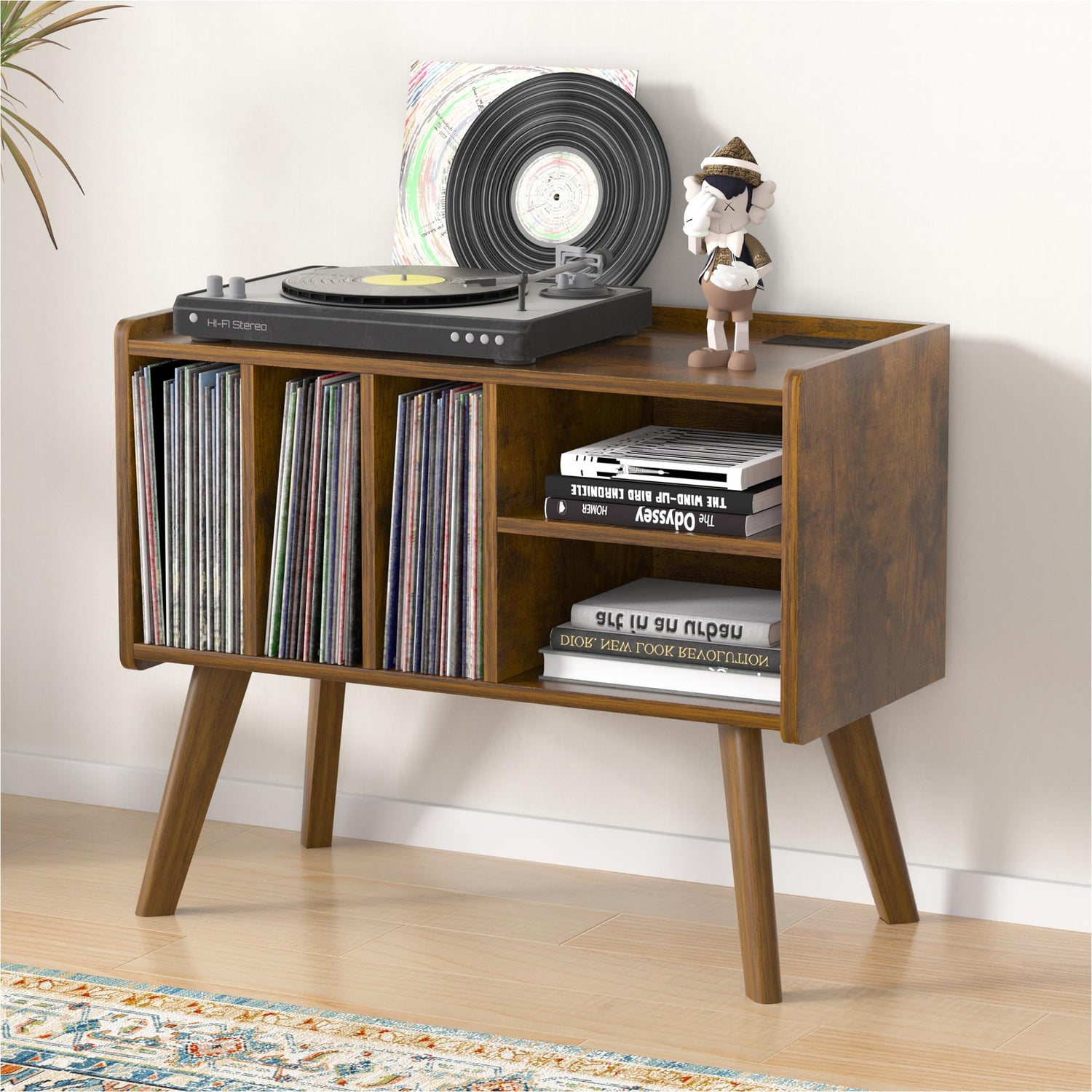 - Mid-Century Modern Record Player Stand: Supported by solid wood legs and covered in a vintage woodgrain finish, this record storage cabinet blends the vintage of woodgrain with modern chic. The back panel with round holes is designed to better hide cables.
