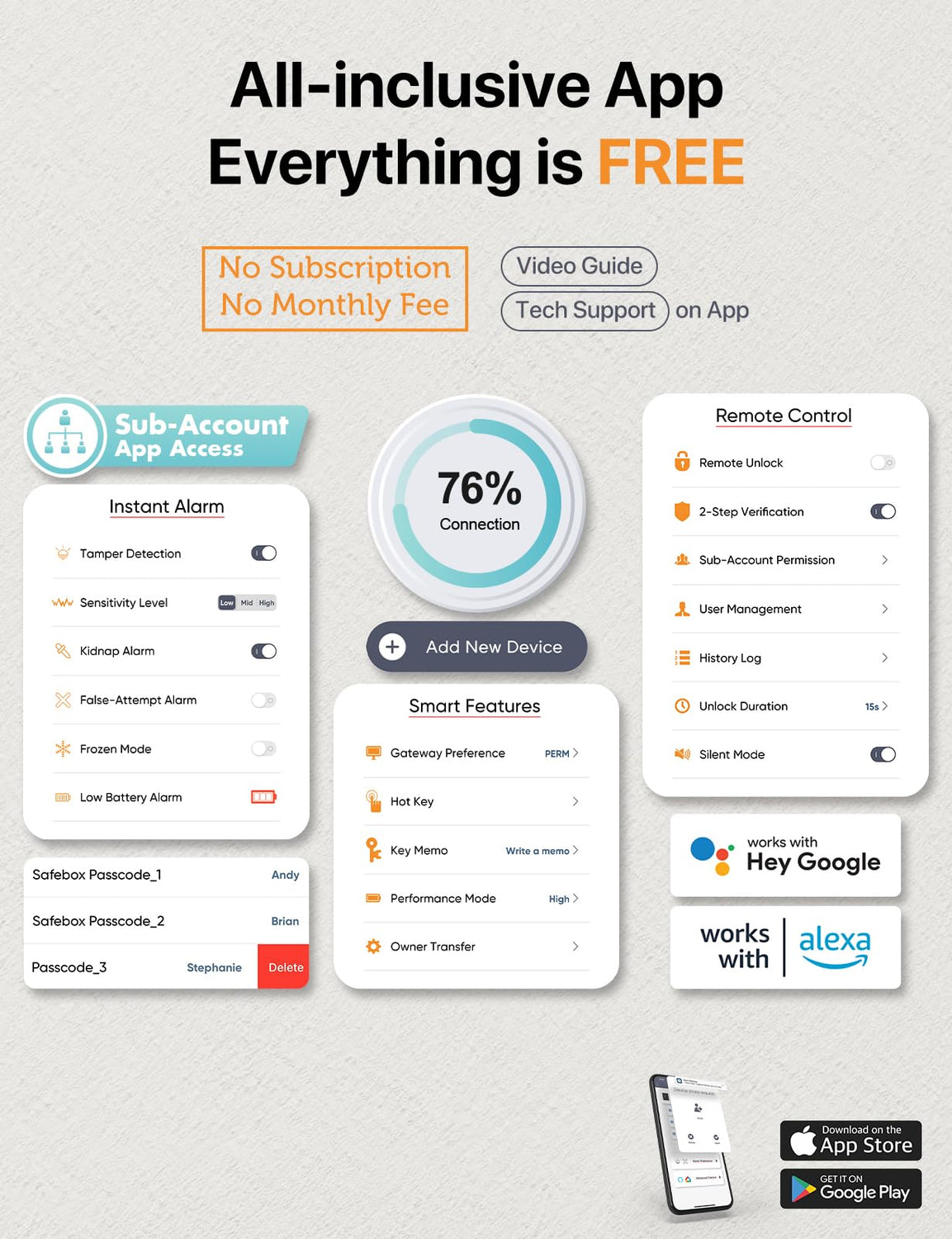 - ONE SAFE FOR WHOLE FAMILY - Register up to 99 fingerprints, 99 passcodes, unlimited number of sub-account App users for your family, with NO subscription required. Smart speakers (Amazon Alexa, Google Home) are also allowed to join in the smart security system.