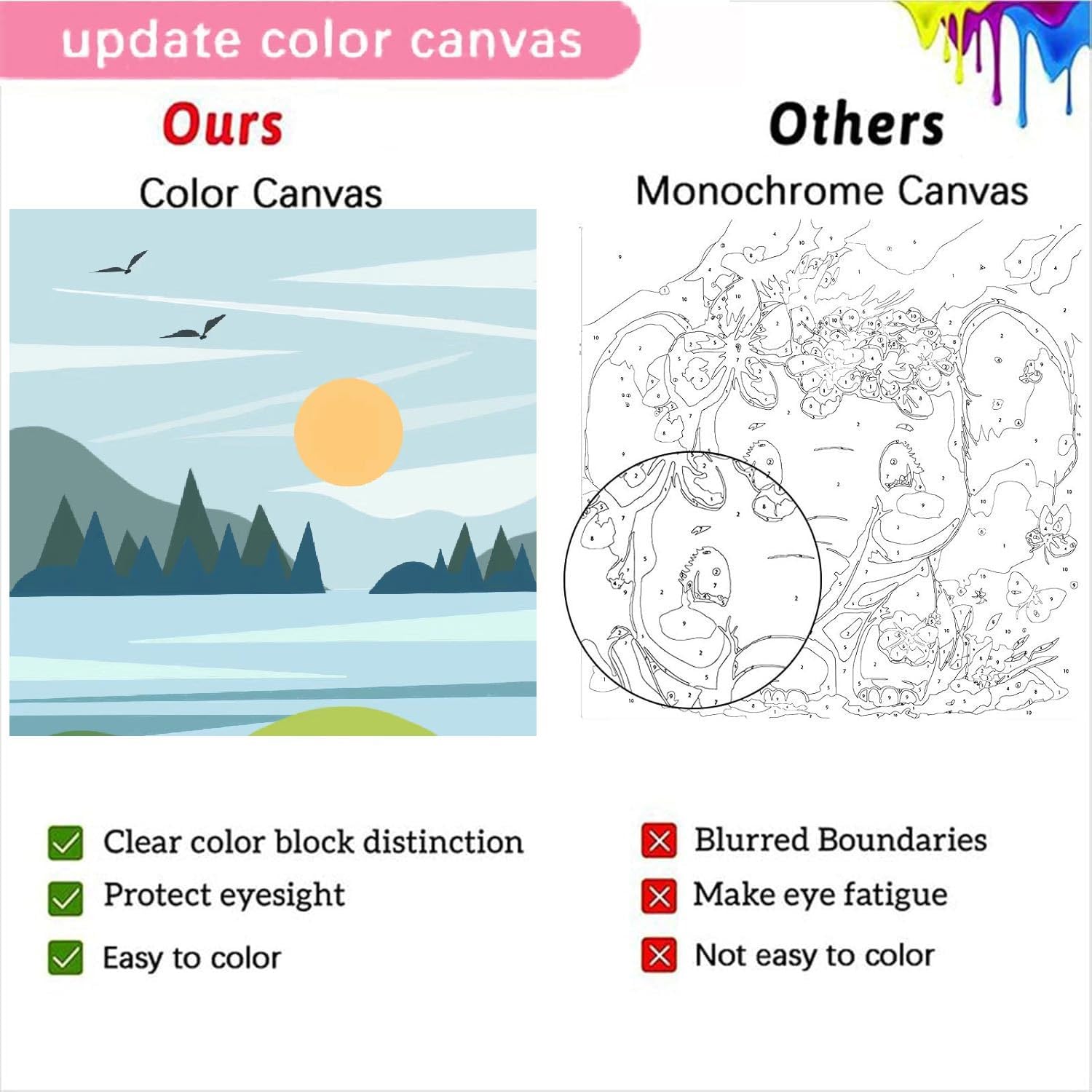 - 【High Quality Materials】 Our High quality paints and canvases with good opacity of paints to cover lines and figures easily, colors, waterproof and fade-free when dry, High definition printing on canvas, while storing for a long time.