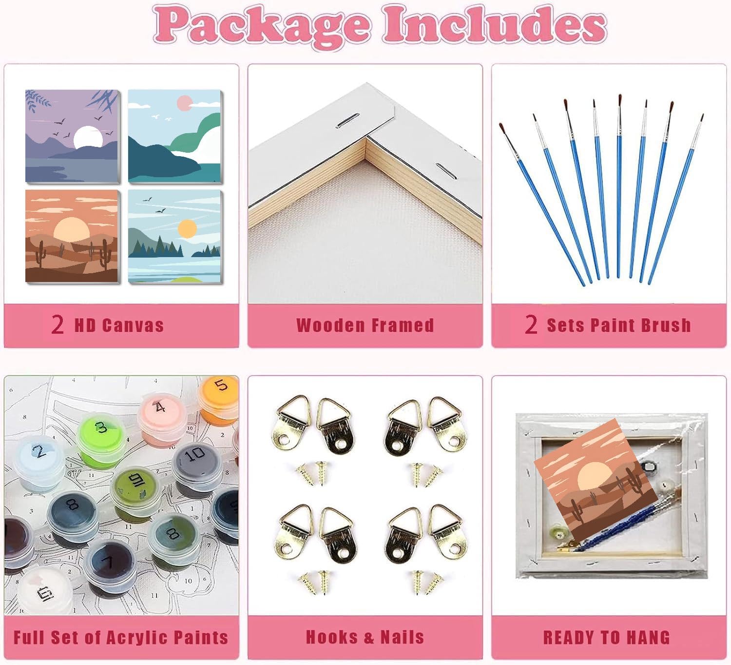 - 【Landscape Paint by Numbers Kit】 You will receive 4 canvas sunset paint by number kits for adults is easy for beginner. Each package comes with 4 sets of 8 x 8 framed paintings, 4 sets of acrylic paints, 8 brushes and instructions. Open the package and you can start painting immediately.