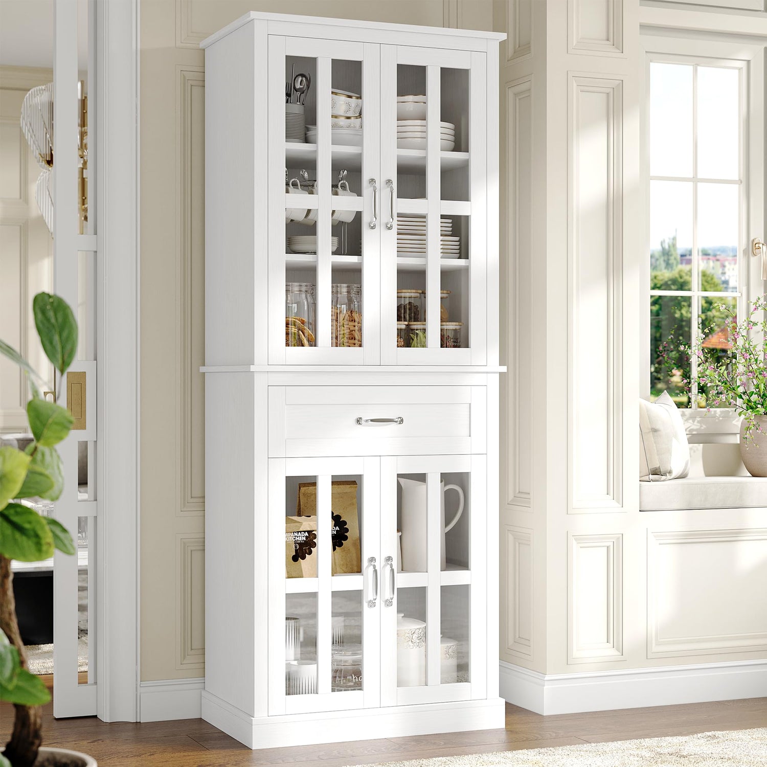 - 【Pantry Cabinet with Amazing Storage】With 5 storage cabinets and a deep drawer, this pantry storage cabinet provides plenty of storage space to keep your household items organized. The glass display cabinet allows you to see the kitchen appliances inside more clearly. Your home can look fabulous without compromising on the ever-important storage. This white pantry cabinet can be used in the kitchen, living room, dining room, entryway, and other corners, or as a file cabinet, display cabinet, or bookcase in your home office.