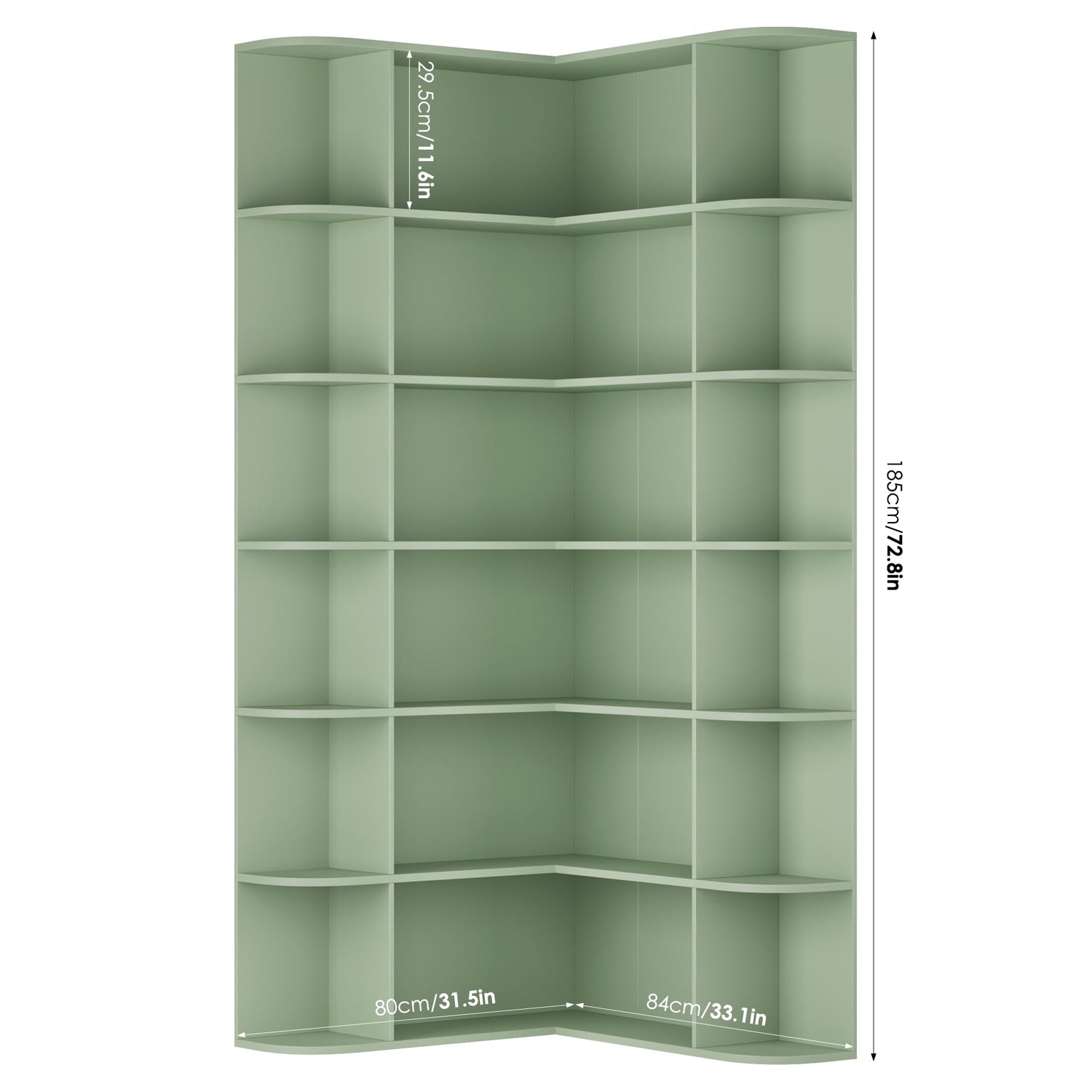 - 【Tremendous Storage Space】The 31.5"D x 33.1"W x 73.9"H 6-tier corner bookshelf perfectly combines elegance and function, which is capable of satisfying your storage demands. Books or other decorations can be kept in it. Furthermore, the space at the top of green bookshelf can also be fully utilized. You can buy small containers for delicate objects.