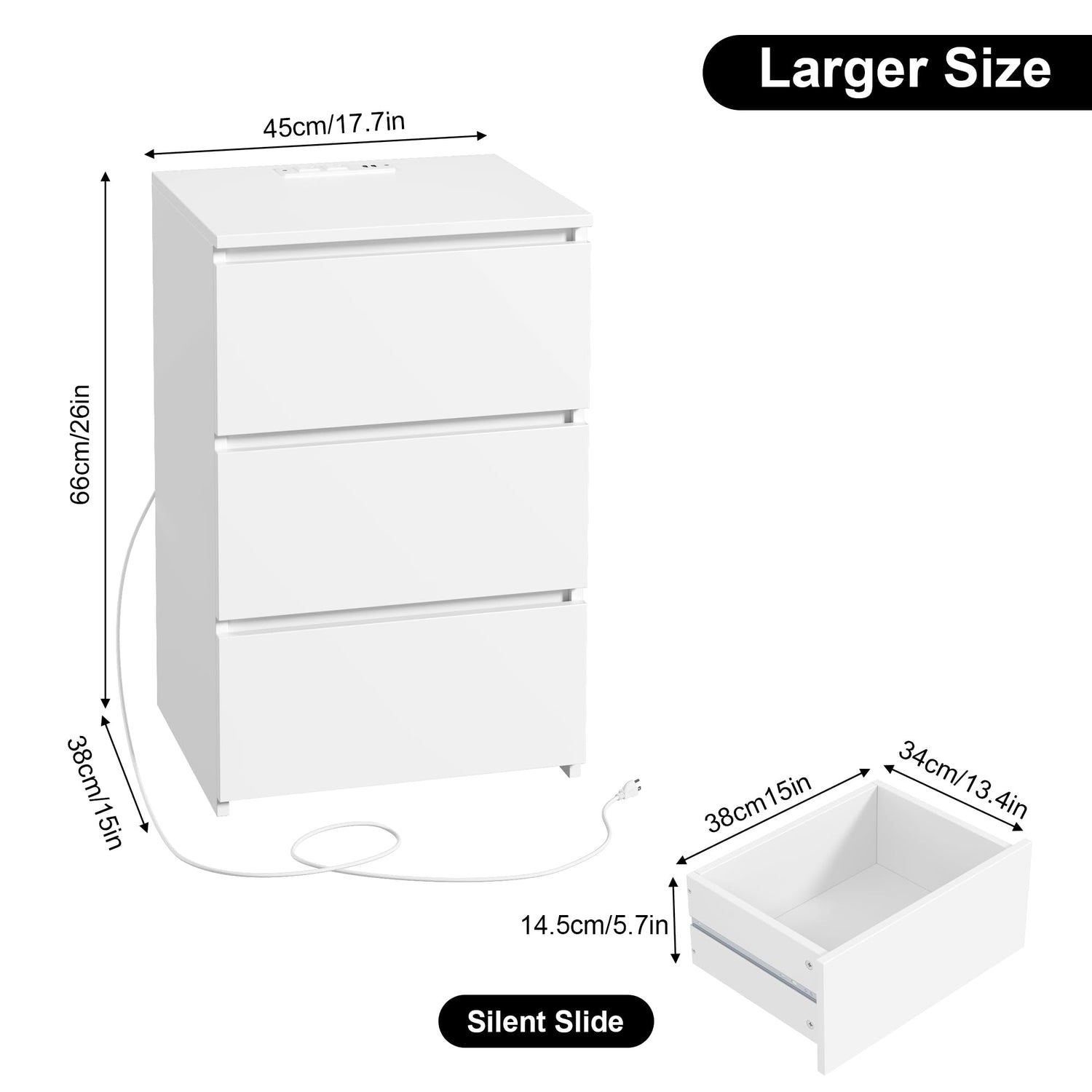 - Multifunctional Night Stand-- With a suitable size of 17.7”W * 15”D * 26”H inches (45*38*66 cm), this white nightstand with charging station and USB ports can be placed in the bedroom, living room, kitchen, office, and so on to help you make your books, table lamp, mobile phone, data cables all well arranged and easy to reach.