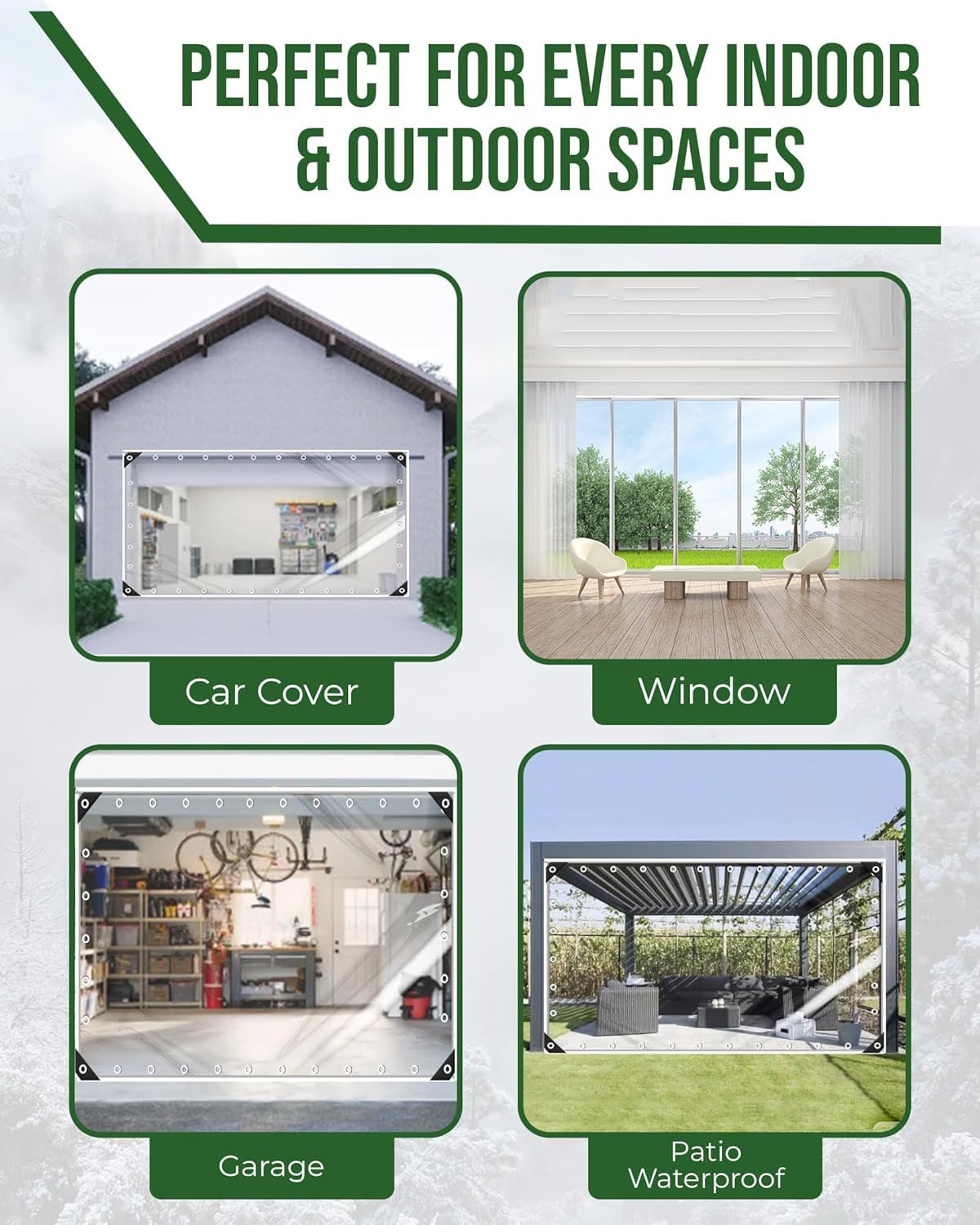 - 【Multifunctional Tarpaulin】: -Greenhouses Tarp- The completely transparent tarp can be used as a cover for greenhouses and tents. -Outdoor Clear Tarp Curtain - The clear see-through Tarp is perfect for Outdoor curtains which make everything visible with layers. Ideal for Patio, Porch, Gazebo, etc. -Cover - Perfect for covering cars, trailers, boats, shelters, wood, furniture, and garden pools. Also suitable for domestic and professional use, e.g. during construction and renovation works.