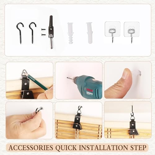 - 【Punch free installation】We offer all necessary hardware included including STICK-ON HOOK+PUNCH FREE HOOK. The stick-on hook allows you to decorate your room with bamboo curtains wherever you want; the other type of hook can be used directly on door and window frames, cutting the hassle of installation and protecting your walls, making installation on doors and windows even easier. Of course we will also provide you with punched hooks, you are free to choose.