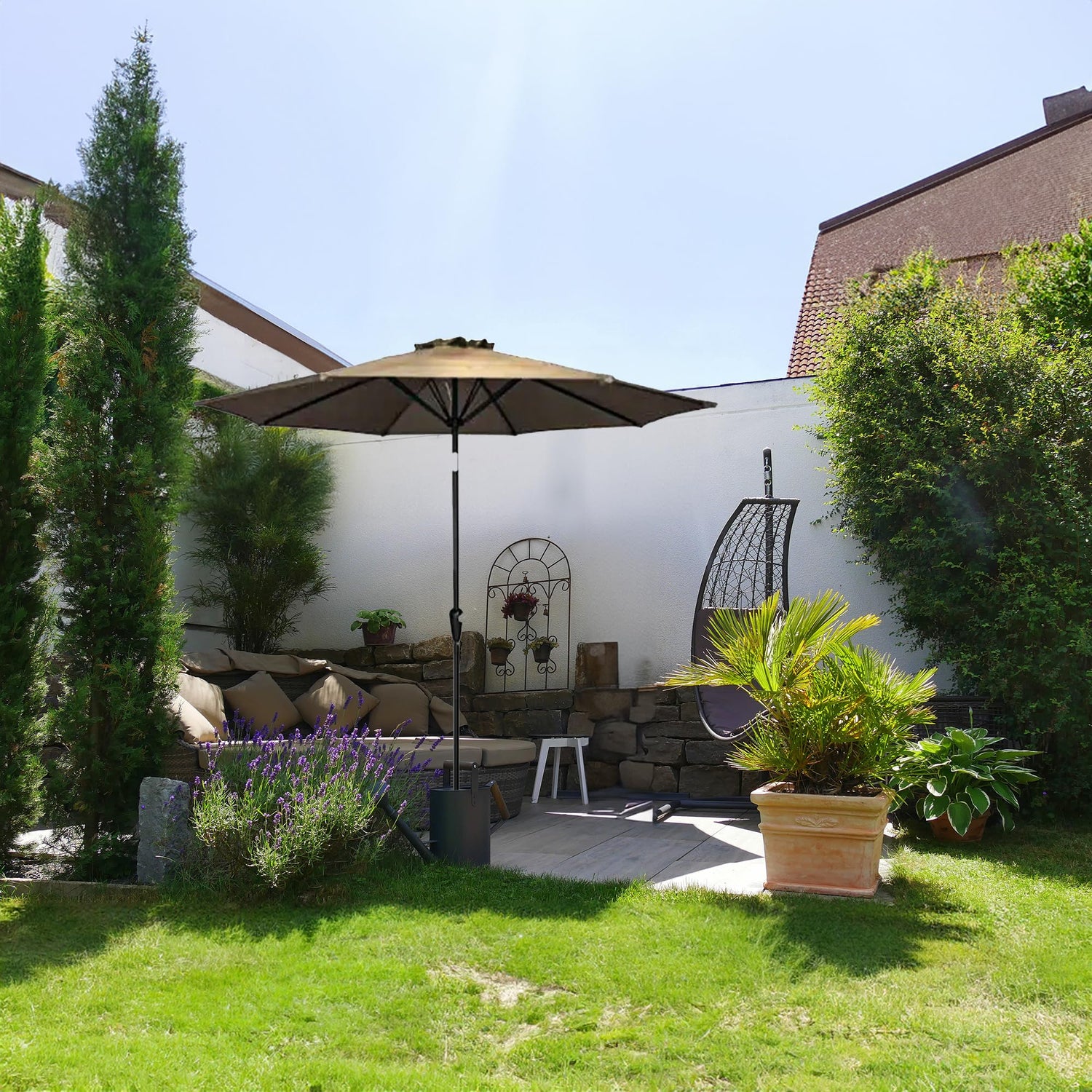 Four Seasons Courtyard 9 Foot Patio Market Umbrella Round Polyester Fabric Outdoor Backyard Shaded Canopy with Crank Lift and Auto Tilt, Taupe