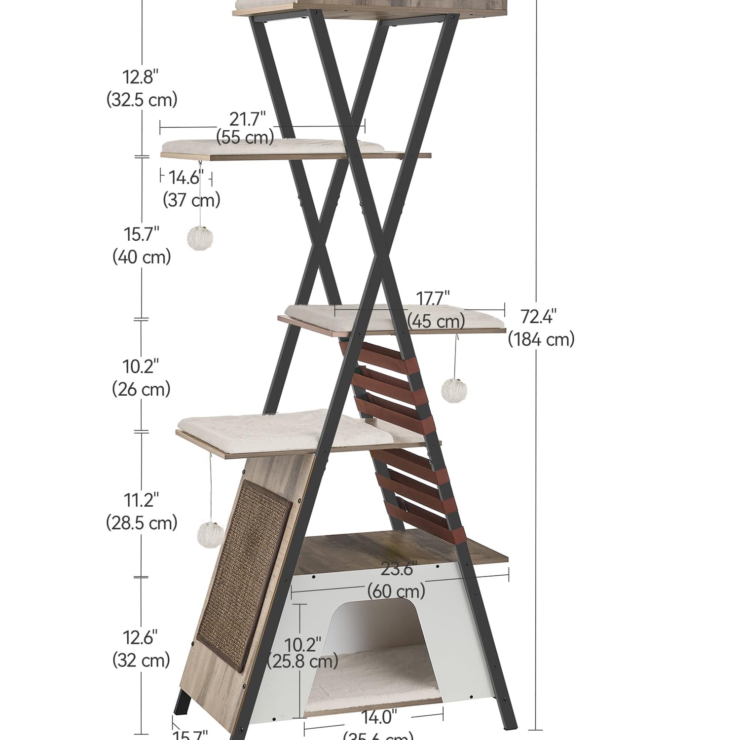 - XXL Cat Tree for Multi-Cat Households: This 72.4 inch high cat tower takes your cat's life to new heights! This tall cat tree has a big top resting place, private apartments, sisal-covered scratching boards, and fluffy pom-poms, providing rest and entertainment for kittens, adult cats and large cats. Each layer provides enough play and climbing space for cats and can accommodate 4-5 adult cats playing at the same time.