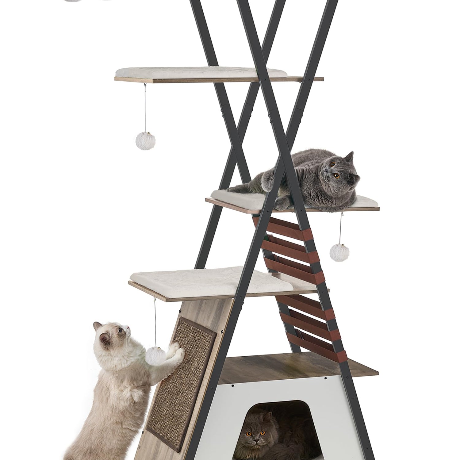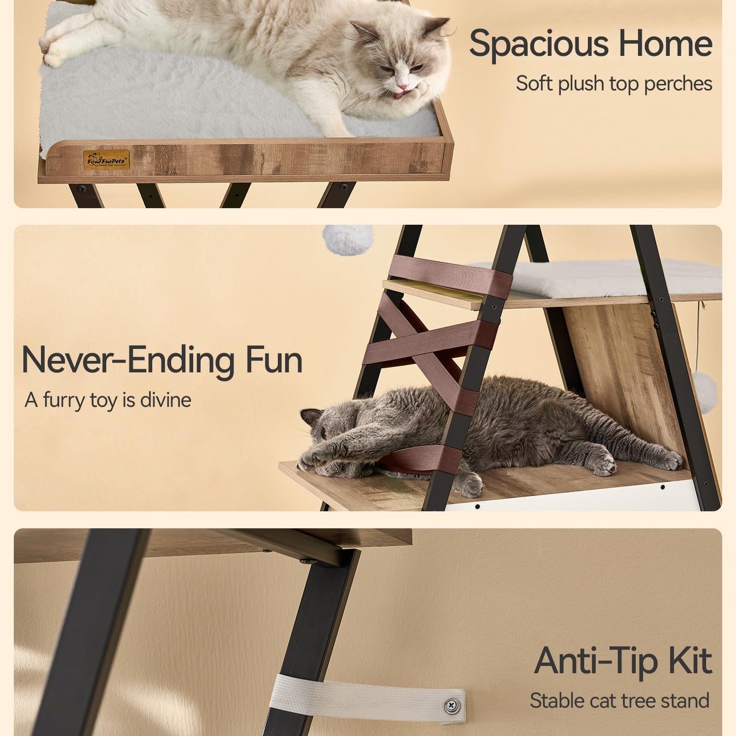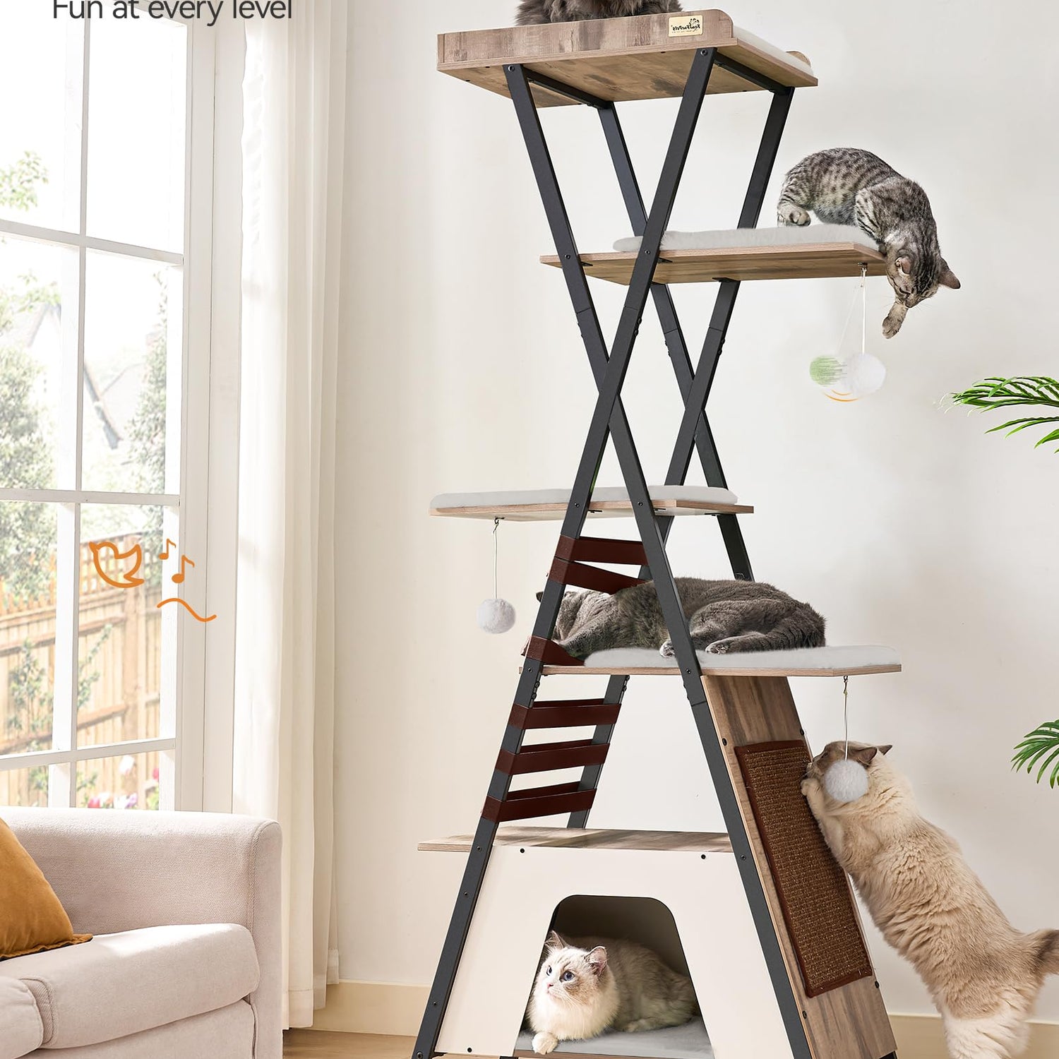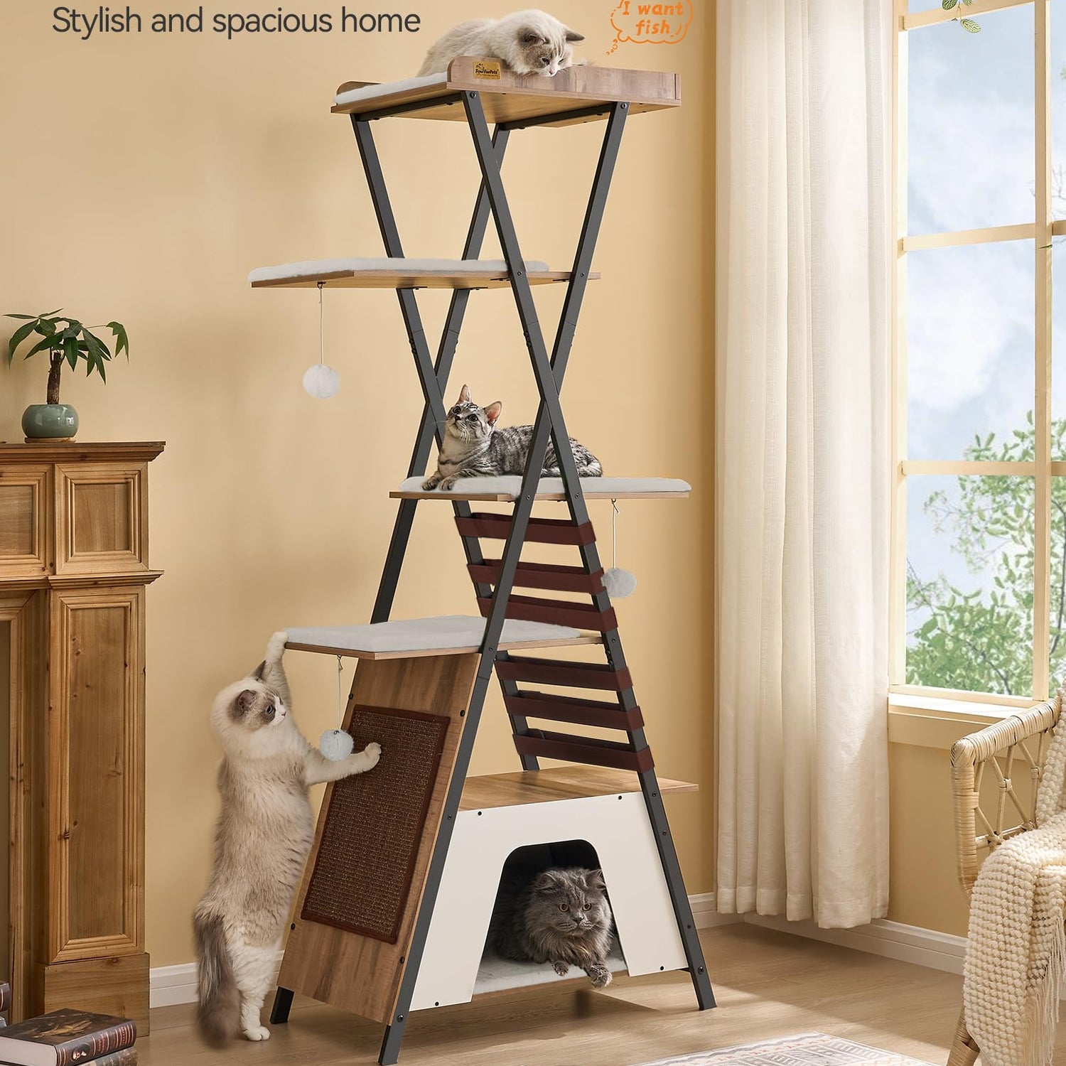 FourFurPets 72.4" Cat Tree, Modern Cat Tower for Indoor Cats, Multi-Level Cat Condo with Caves, Tall Cat Tree with Cat Scratching Board, Wooden Cat Tower with Large Perch, Removable Pads, Camel Brown