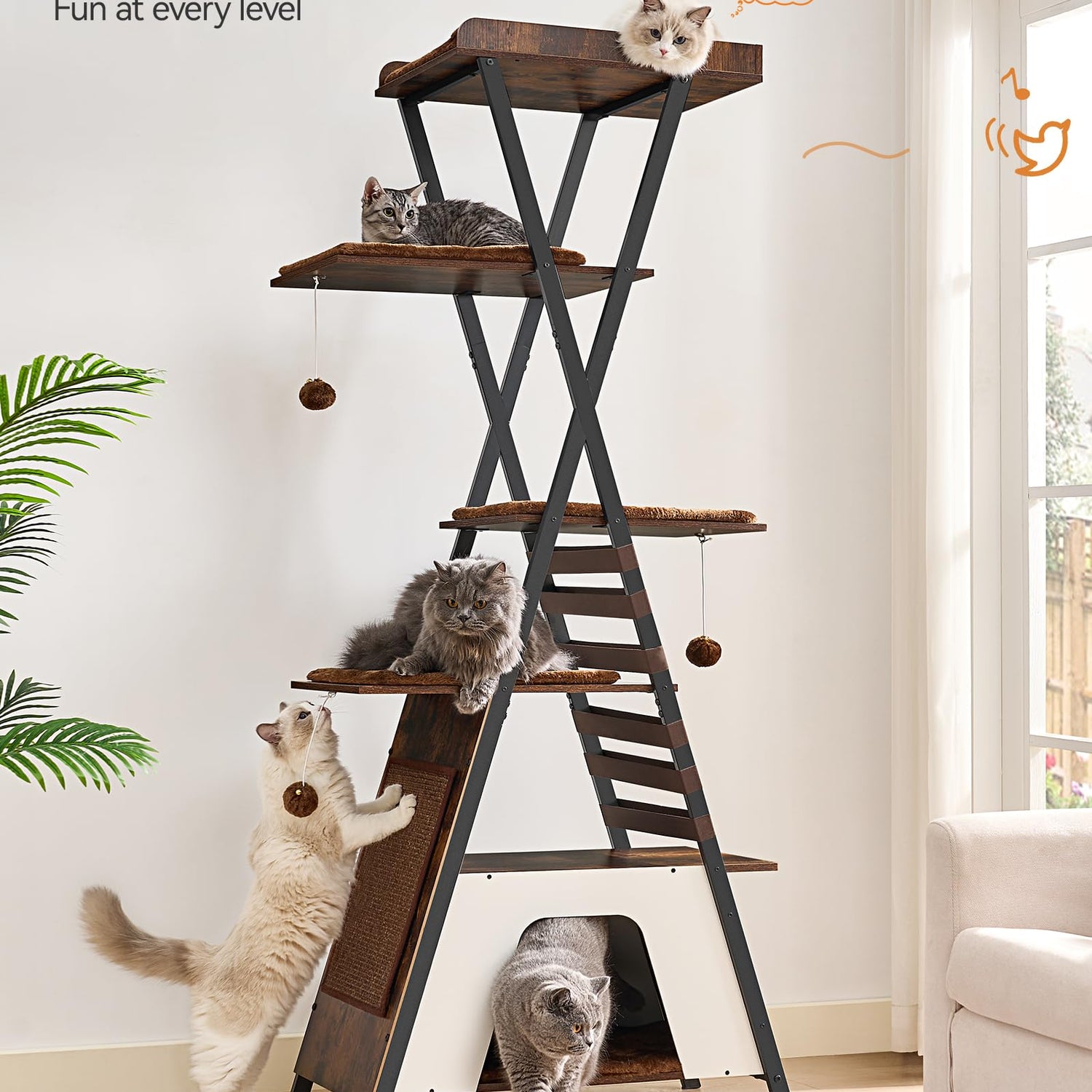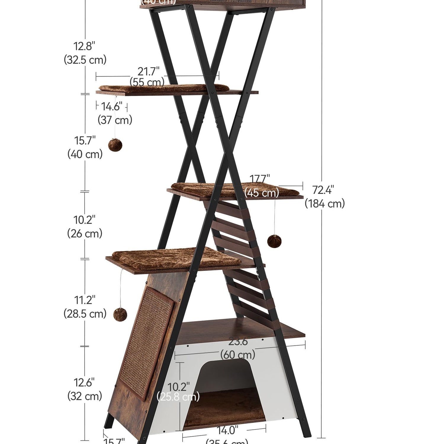 - XXL Cat Tree for Multi-Cat Households: This 72.4 inch high cat tower takes your cat's life to new heights! This tall cat tree has a big top resting place, private apartments, sisal-covered scratching boards, and fluffy pom-poms, providing rest and entertainment for kittens, adult cats and large cats. Each layer provides enough play and climbing space for cats and can accommodate 4-5 adult cats playing at the same time.