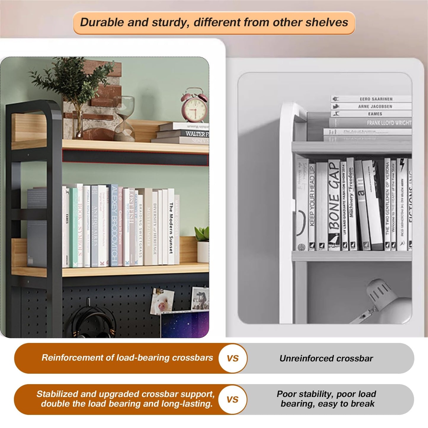 Experience robust construction with a high load-bearing frame, where each layer can support an impressive 55lbs. Crafted from high-quality materials, it features 25mm thickened square steel pipes and 16mm thick high-density boards. This ensures that your bookshelf remains stable, scratch-resistant, and wear-resistant, far surpassing other options made from thinner materials.