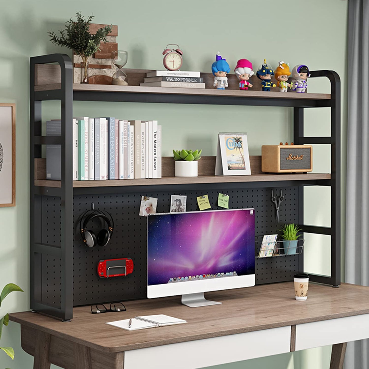 Featuring overall dimensions of 29.5 x 10.62 x 41 inches, and with additional sizes available, it's suited for accommodating up to 32-inch computer monitors, making it ideal for various settings whether you're at your desk, in a study, or even a kitchen workspace. The middle storage compartment offers a generous clear height of 11.8 inches, while the bottom space allows for 21.25 inches of clearance for larger items.
