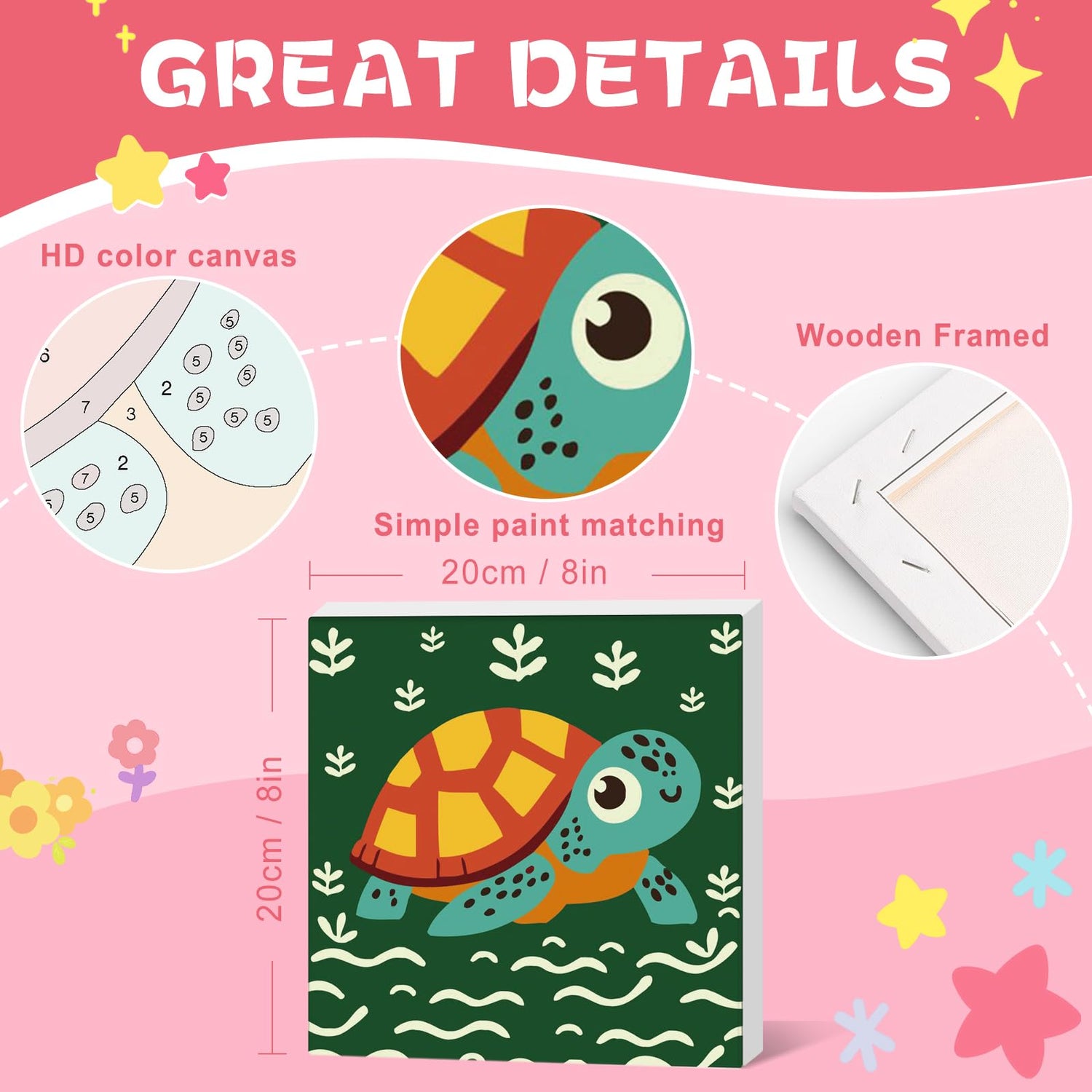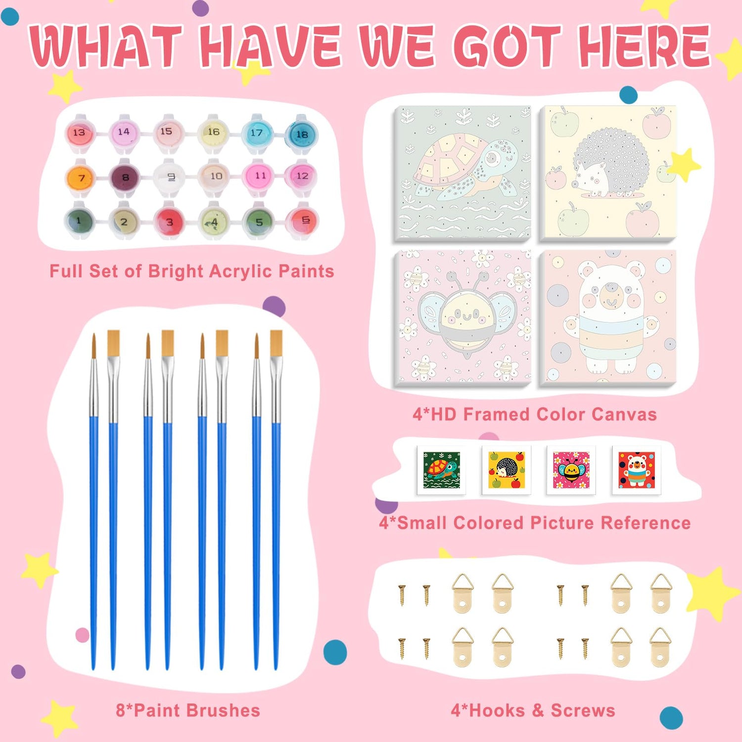 - What You Will Get: Paint by numbers kit for kids 4-8 comes with everything you need, including 8*nylon brushes, 8*hook and nails, 4*matched Acrylic paint and 4*HD Canvas with Frame. Open the package and you can start painting immediately