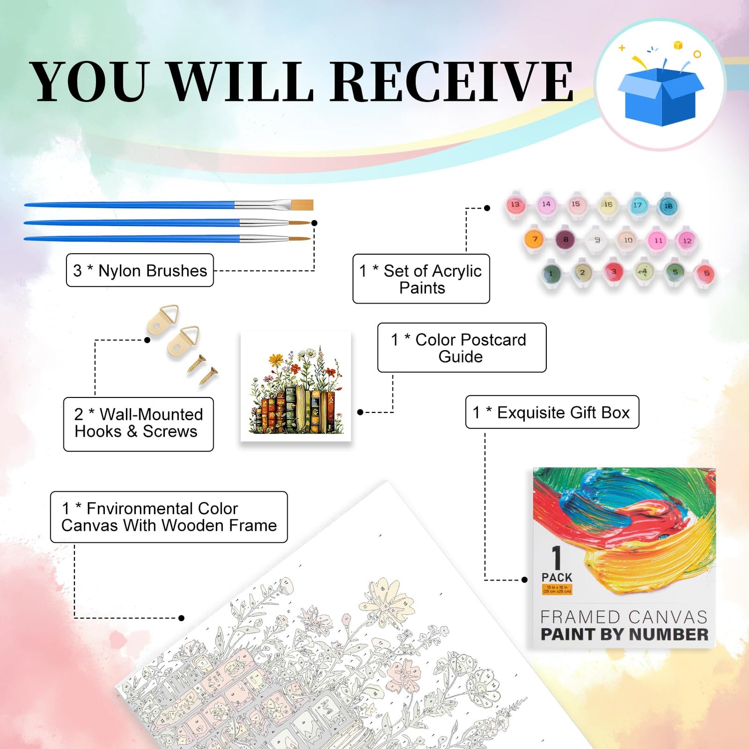 - 【Framed Paint by Numbers Kit for Adult】 Camocin paint by numbers kit for adults framed has 1 x HD color canvas with wooden frame, 1 set of acrylic paints, 3 x nylon brushes, 2 x wall-mounted hooks & screws, 1 color postcard guide, 1 paper copy of numbered canvas for reference and a colorful gift box, no need to prepare any other tools, just open the package and paint.