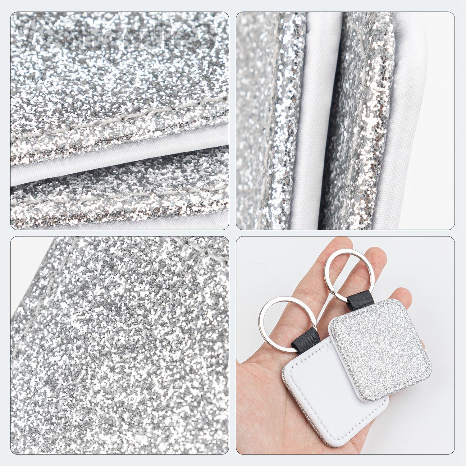 Framendino, 16 Pack Sublimation Blank Keychain Glitter PU Leather Square Rectangle Heat Transfer Key Fob Key Chain for DIY Craft Making Silver
