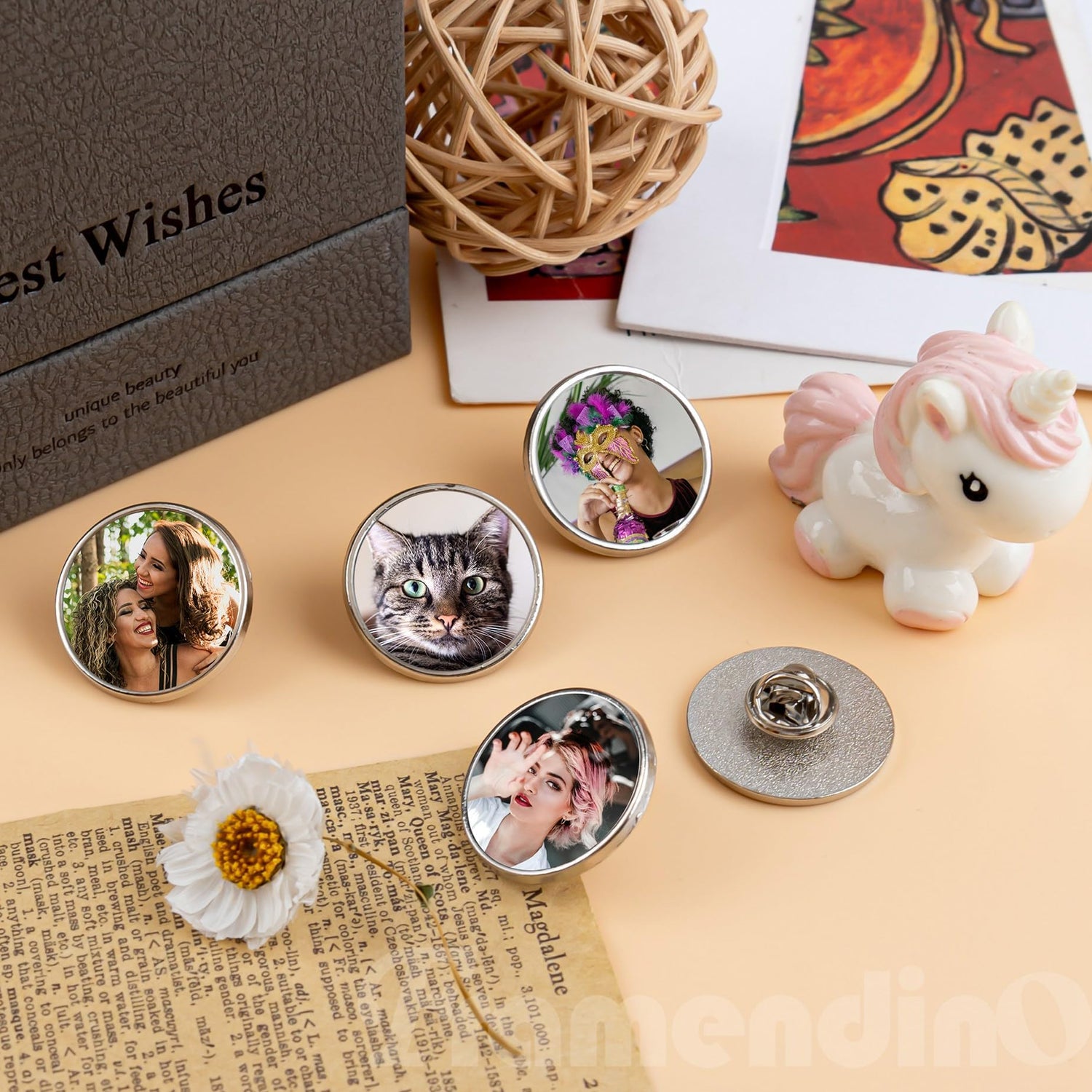 - (Material) The DIY Button Badges Are Made of Zinc Alloy and Round Aluminum Sheets, There is Double - Sided Tape On The Top of The Badge to Easily DIY Your Button Badges