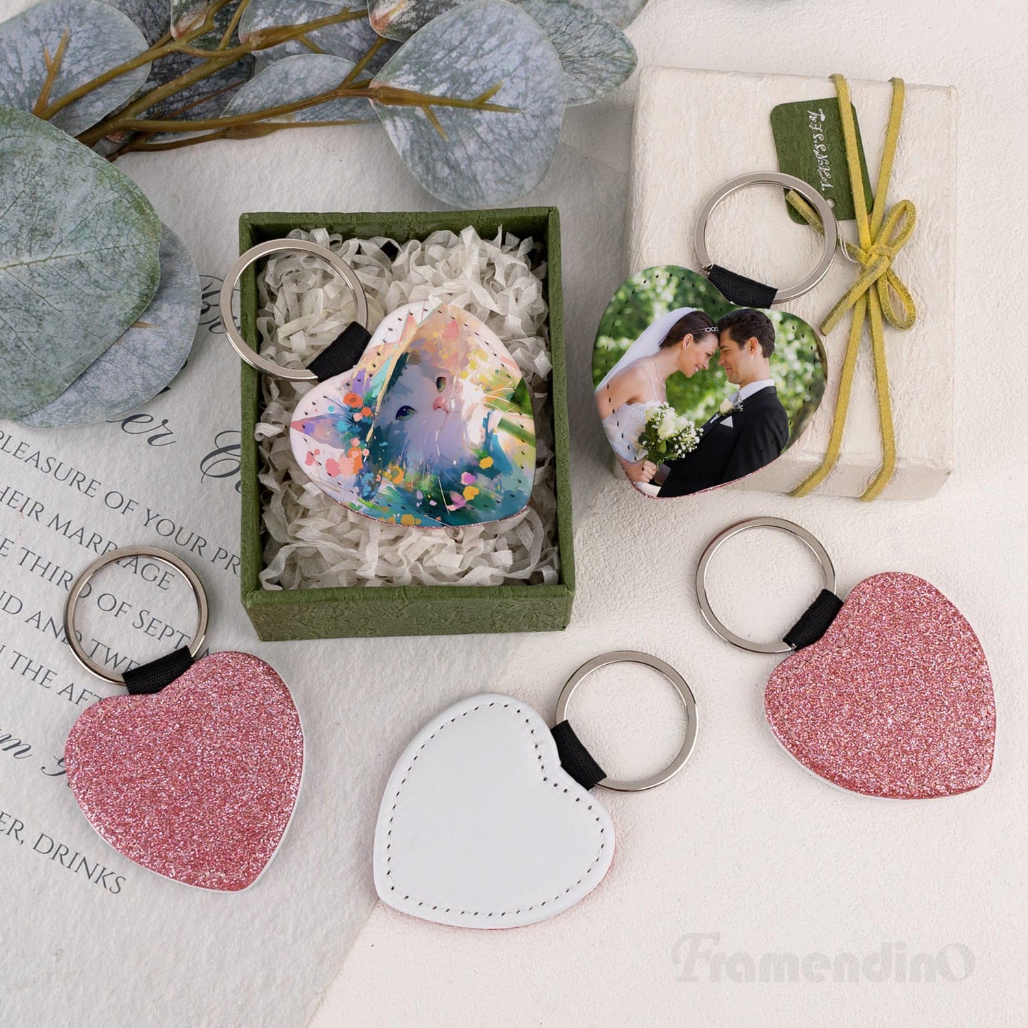 Framendino, 8 Pack Sublimation Blank Keychain Glitter PU Leather Love Heart Heat Transfer Key Chain for Personalized DIY Crafts Photo Pink