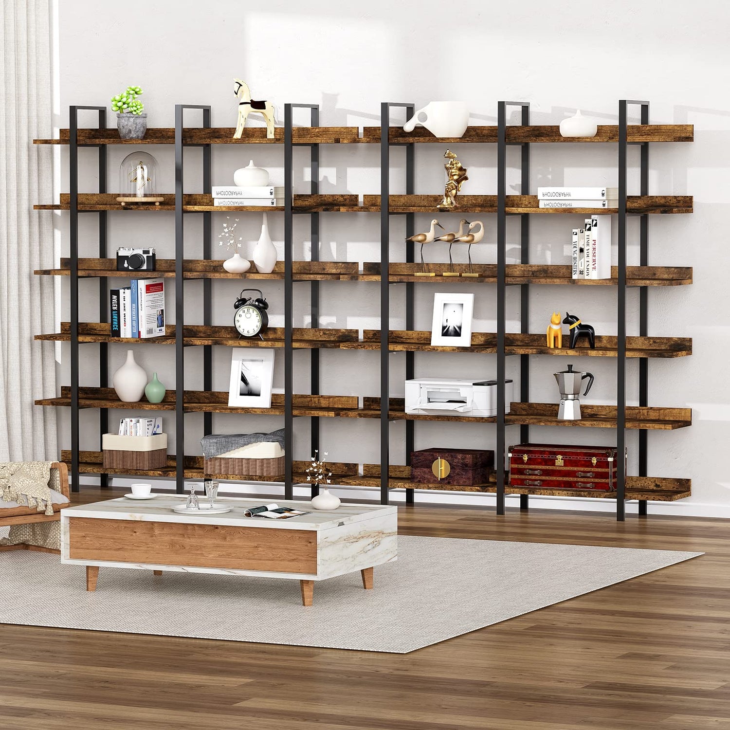 FRAPOW 83Inch Industrial Bookshelf and Bookcase, Double Wide 6 Tier Large Vintage Book Shelf with Metal Frame Open Bookshelves for Living Room Home Office