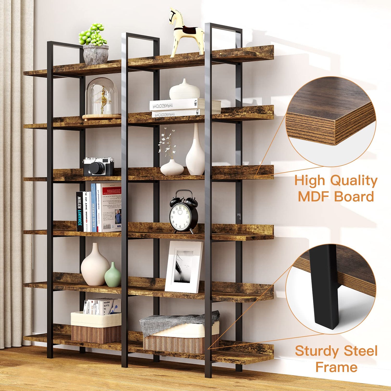 - 6 Tier Double Wide Large Space: This bookshelf with storage shelves can provide enough space to meet your daily storage needs. The double wide 6-tier open shelves make full use of the space for you to display books, CDs, collectibles, family portraits, toys, crafts,books. Both decoration and storage functions make your room elegant, concise, and organized