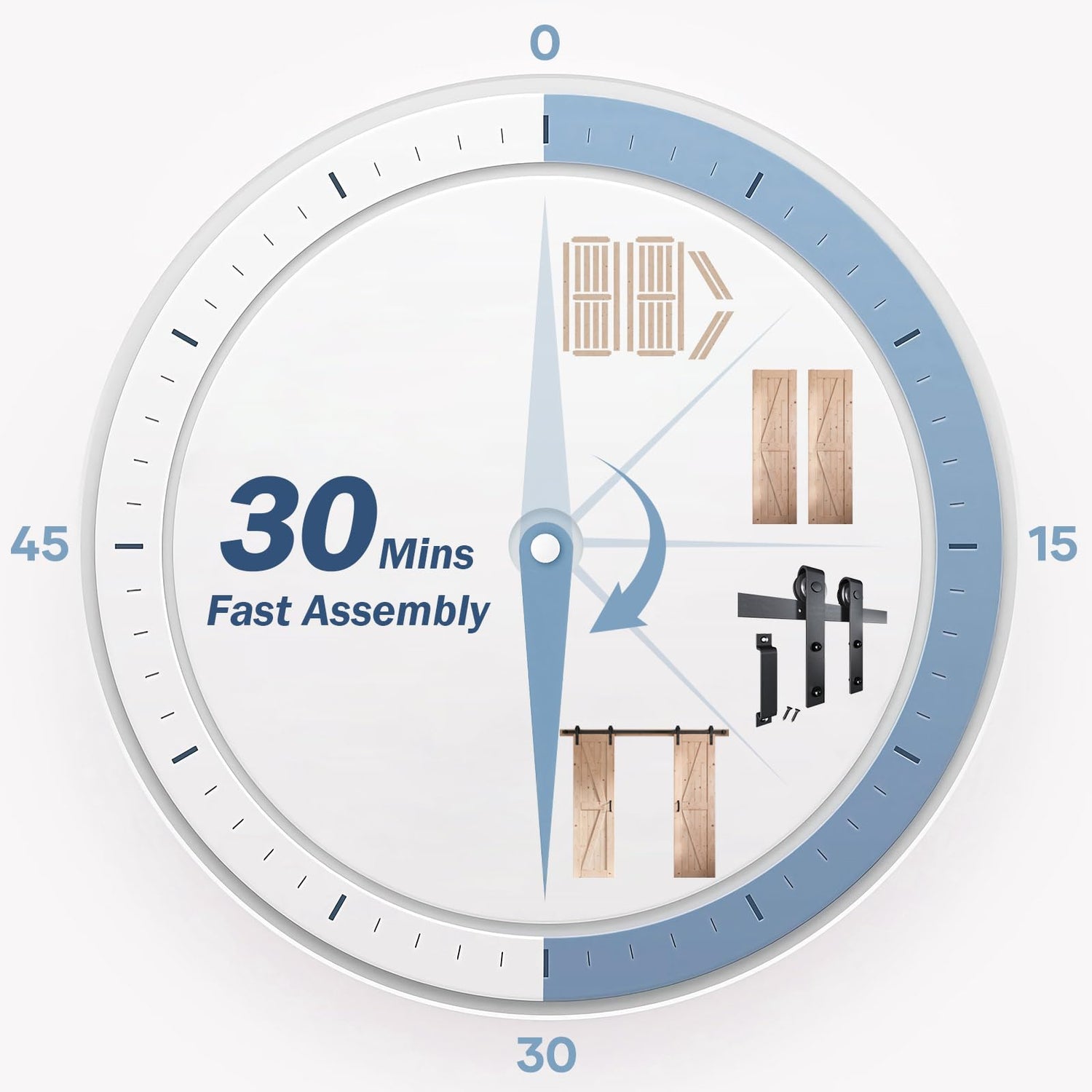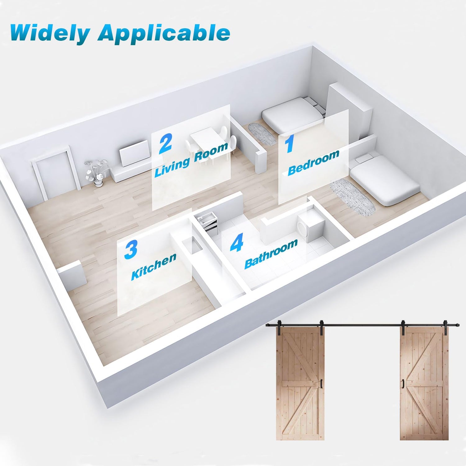 - Dimension: Width: 72", Height: 84", Thickness: 1 3/8", Solid core thick: 1/2". Door can be flipped in either direction. The bottom of the door had been a pre-made groove for the floor guide. / WEIGHT: 53lbs. (PACKAGE INCLUDED: All screws included along with pre-drilled screw holes wood panels and detailed instruction ensuring ease of assembly. 13FT Track Kit:2x 6.6FT Track,4x Hanger,5x Spacer,2x Floor Guide,2x Pull Handle.