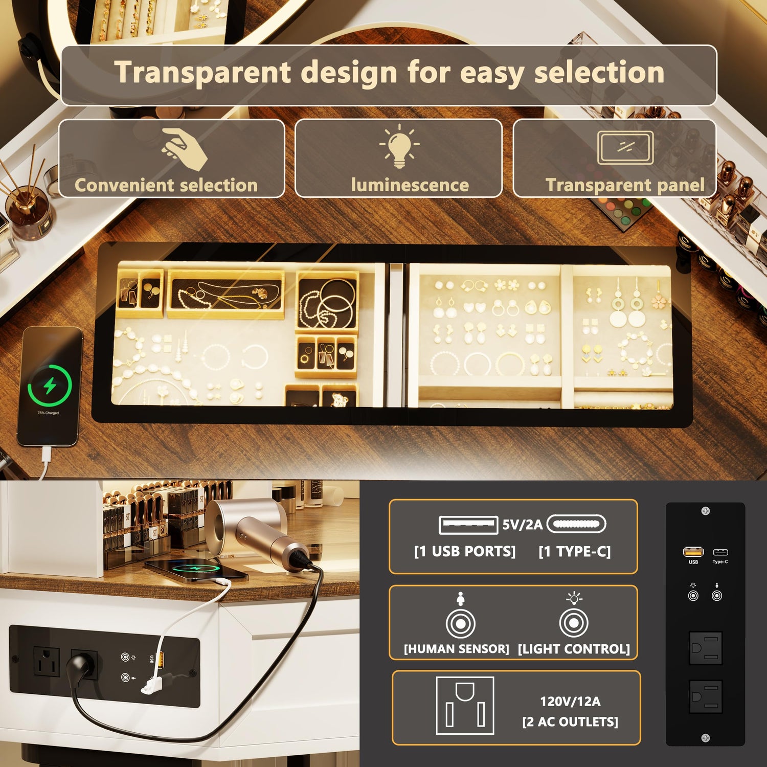 - Makeup Vanity with Power Outlet&Human Sensor: Modern Dressing table with 1x USB port, 1x Type-C,2 x Outlets Ports , easily charge your electronics without having to search for a separate power source,Vanity with human sensor lights, auto lights ON when detect human approach during 2-3M