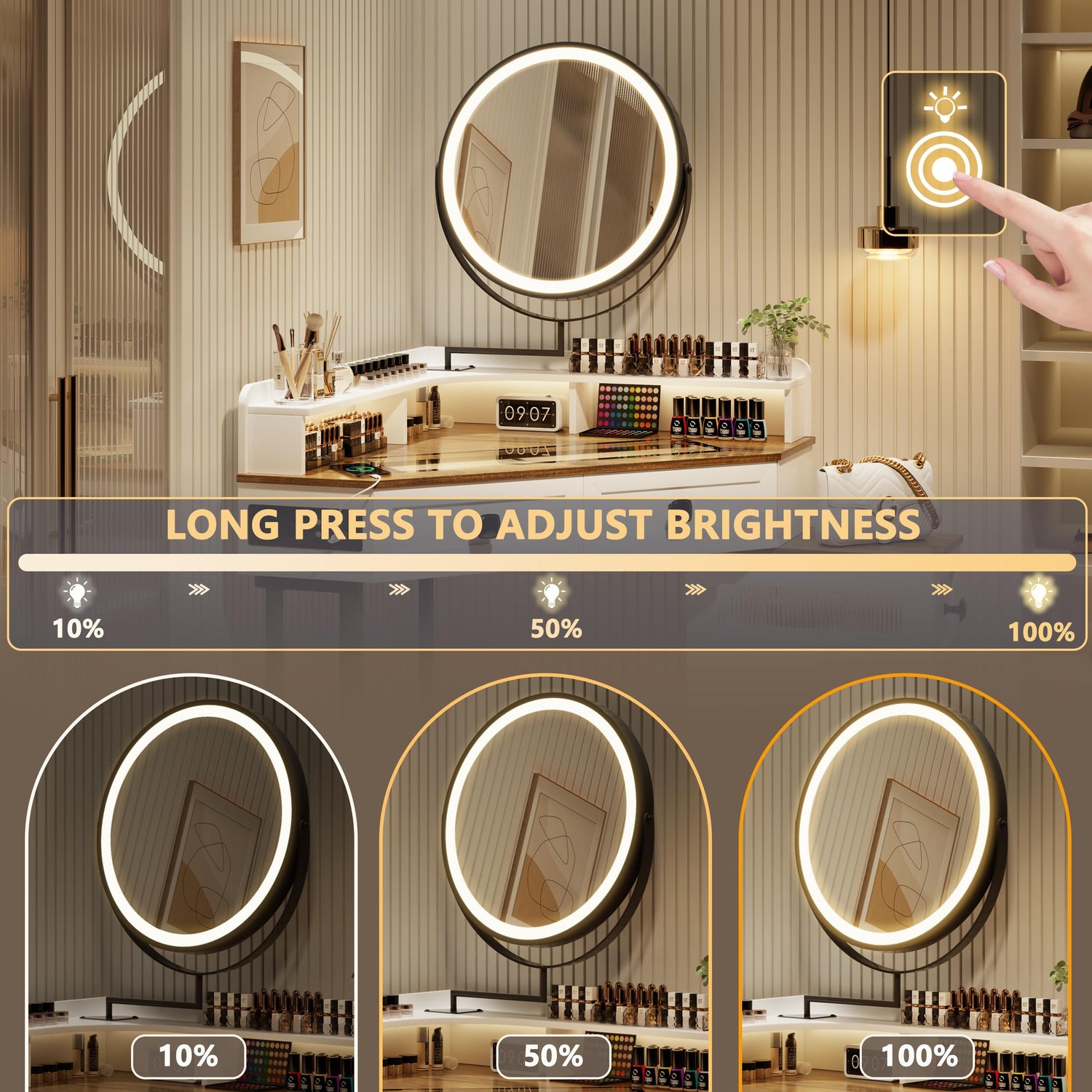 - 3-color LED lights, adjustable brightness: The dresser is equipped with 3-color lights and mirrors, the brightness is 0-100% adjustable, to meet different requirements, the one-button control lamp has intelligent memory function, the mirror can move and rotate 360°, to achieve multi-angle makeup