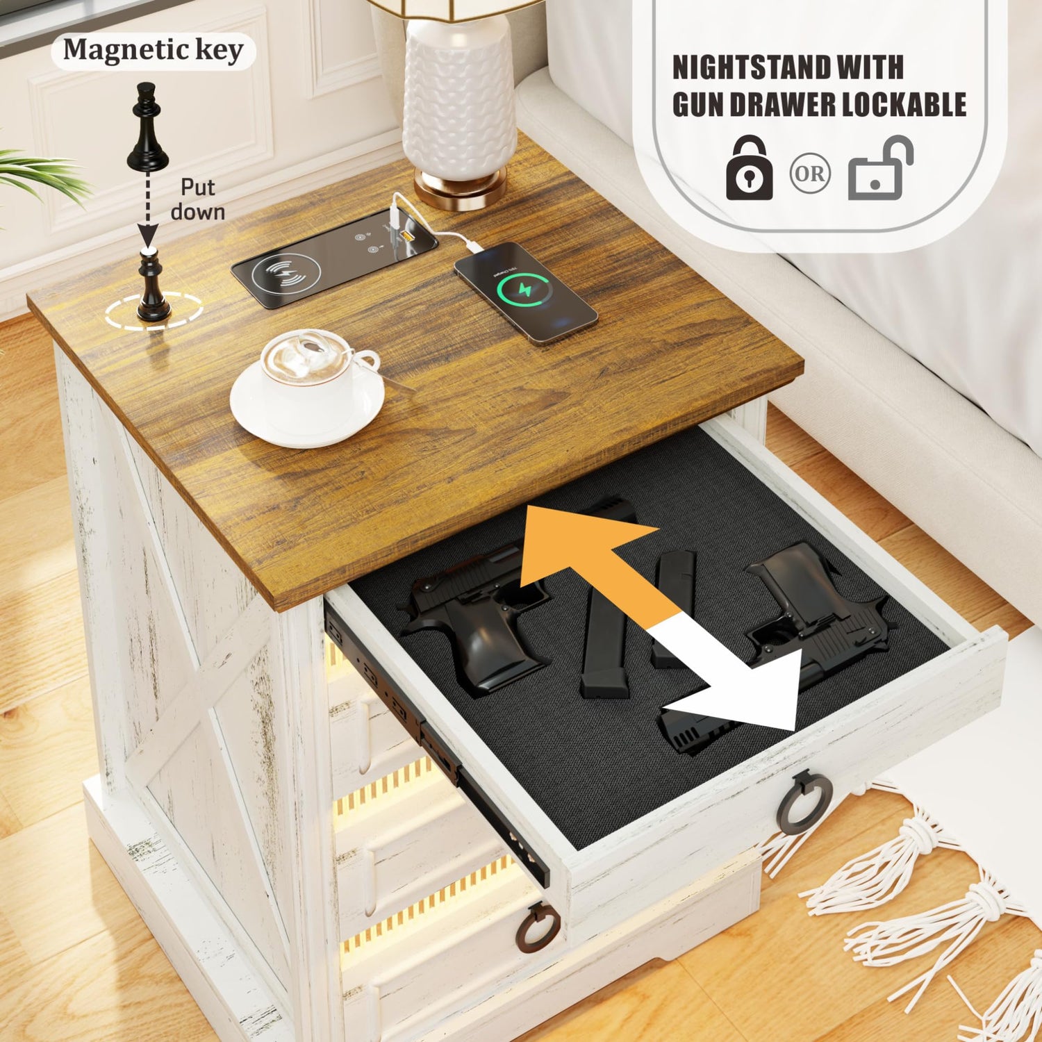 FREDEES Farmhouse Night Stand with Charging Station, Bedside Table with LED Light & Gun Drawer, Nightstands for Bedroom Living Room, End Table Antique White