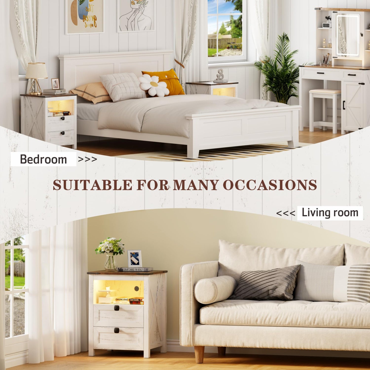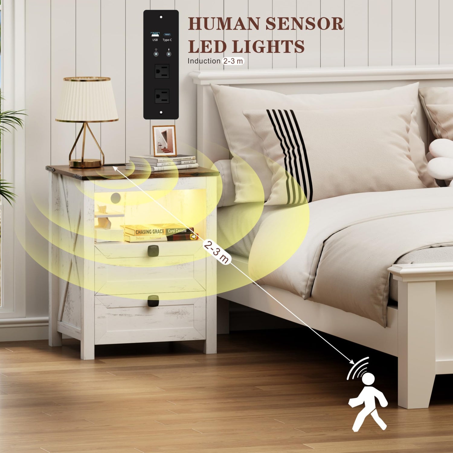 FREDEES Farmhouse Nightstand with Charging Station & Power Outlets, Smart LED Night Stand with Human Sensor 3 Color Lights&Drawers, Farmhouse End Side Table for Bedroom/Living Room, Antique White