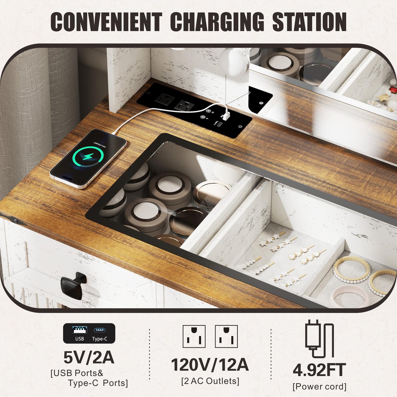 - Built-In Charging Station: This vanity comes with 2 AC power outlets, a USB port, and a Type-C port. Conveniently charge your hair dryer, curling iron, or other devices without needing extra outlets