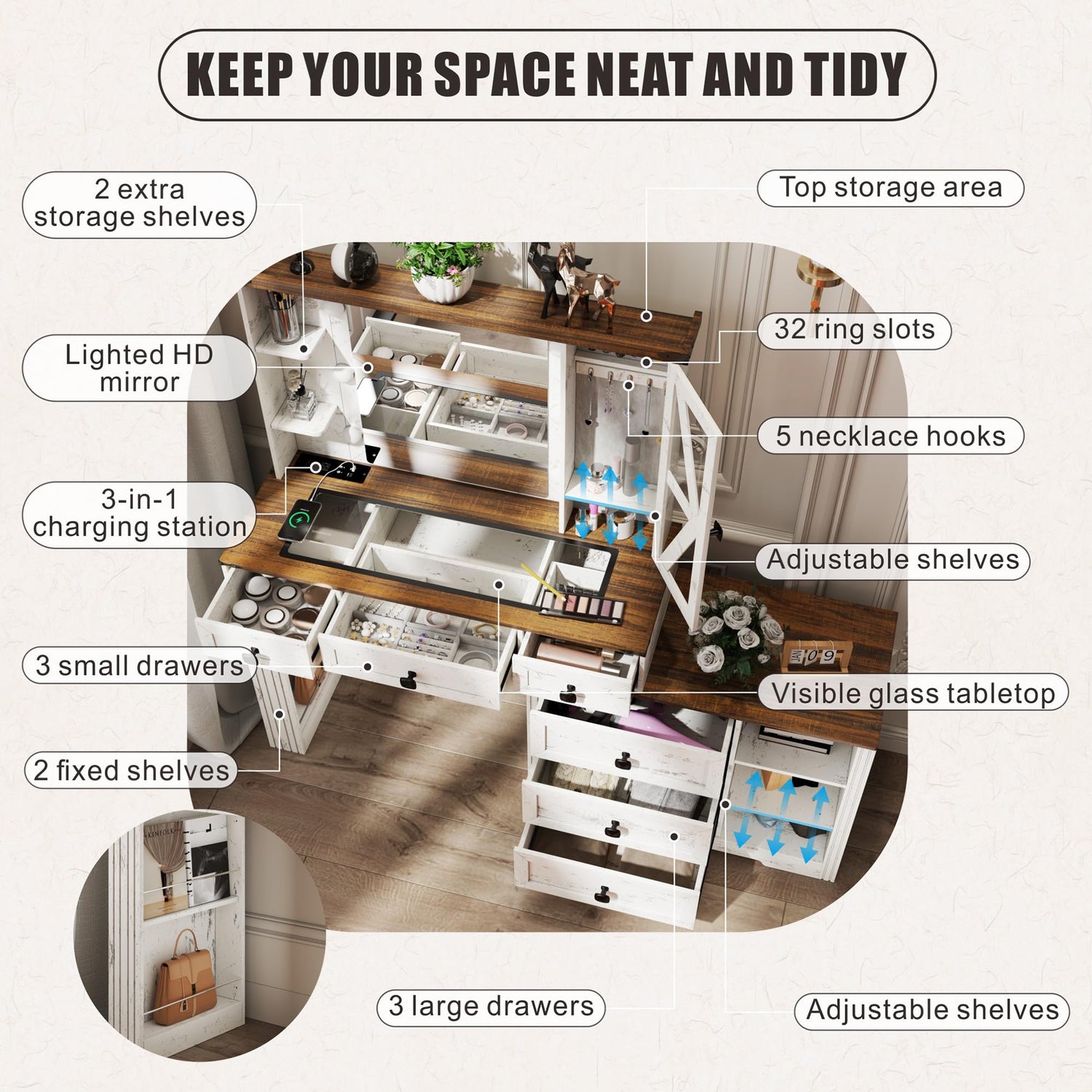 - Extra Jewelry Cabinet with Clear Door: The farmhouse-style vanity includes an additional jewelry cabinet with 32 ring slots and 5 necklace hooks. The clear acrylic door panel allows you to view your jewelry while keeping it dust-free