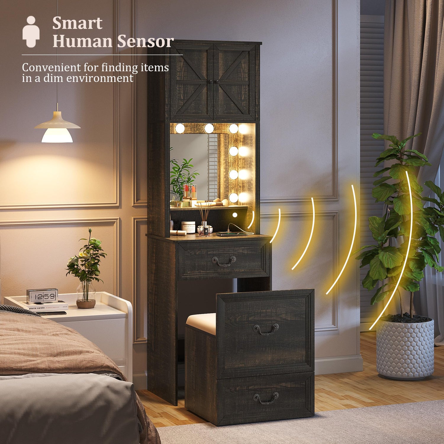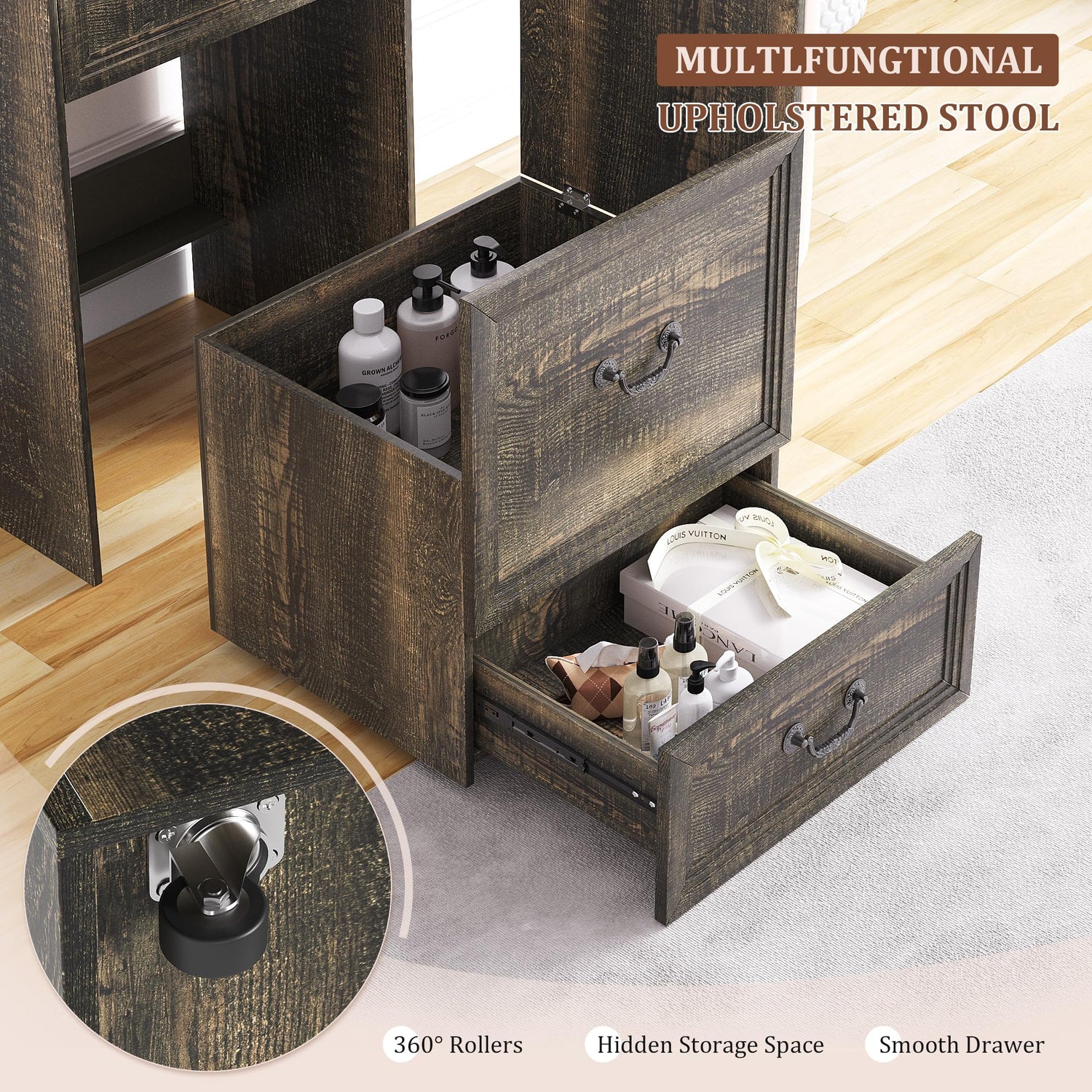 FREDEES Vanity Desk with Mirror and Lights, Compact Makeup Table w/Storage Drawers & Shelves, Farmhouse Vanity Table with Hidden Chair for Bedroom, Gift for Girls Lady, Rustic Brown