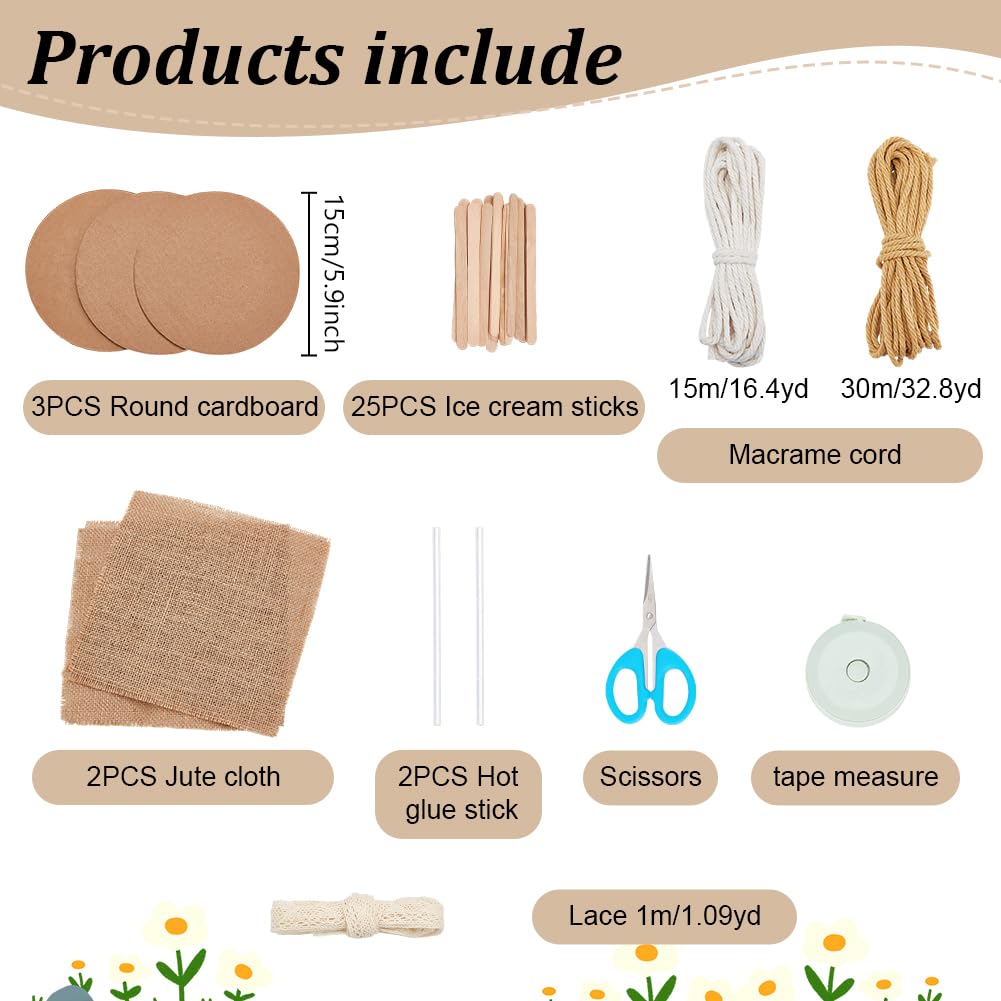 - What You Will Get: The package includes 3 round corrugated cardboard 15cm, 25pcs craft sticks, cotton rope 45m in 2 colors, tape measure, 2 hot melt glue sticks, jute cloths, lace trim 1m and other tool you may need.