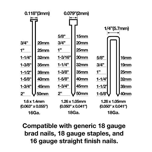 - Compatible with 16 gauge finish nails from 3/4" to 2", 18 gauge brad nails from 5/8" to 2", and 18 gauge 1/4" narrow crown staples from 5/8" to 1-5/8"
