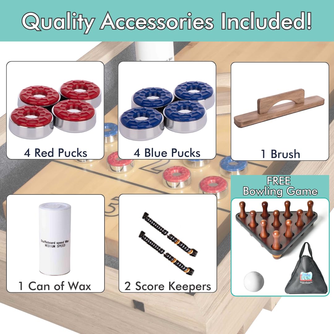 - 12 FT 2-PIECE SHUFFLEBOARD SUPPLIES INCLUDED: 4 blue and 4 red pucks, 2 abacus scoring units, eva end protection pads, shuffle board table wax and brush. FREE Bowling Pin Game