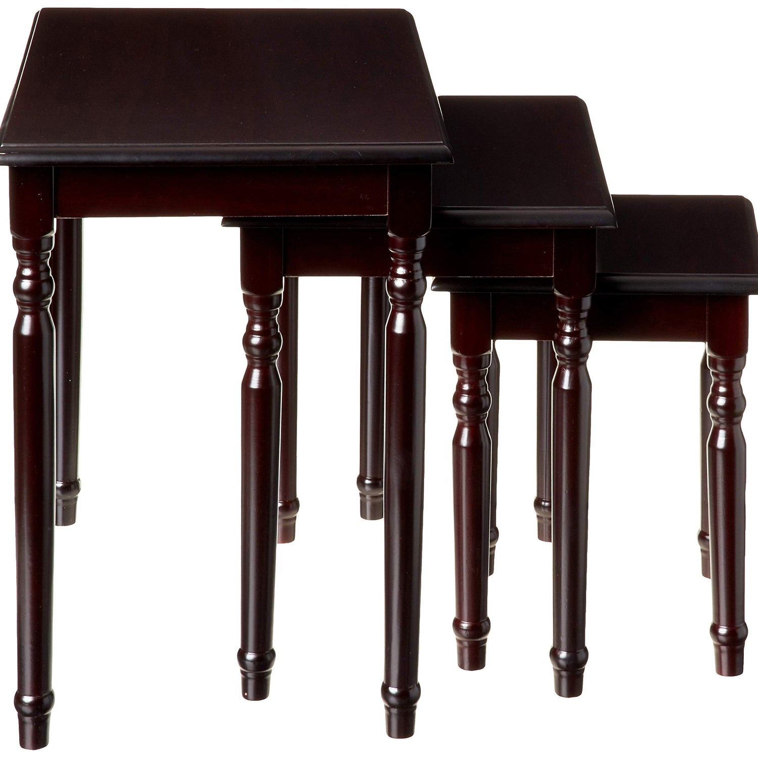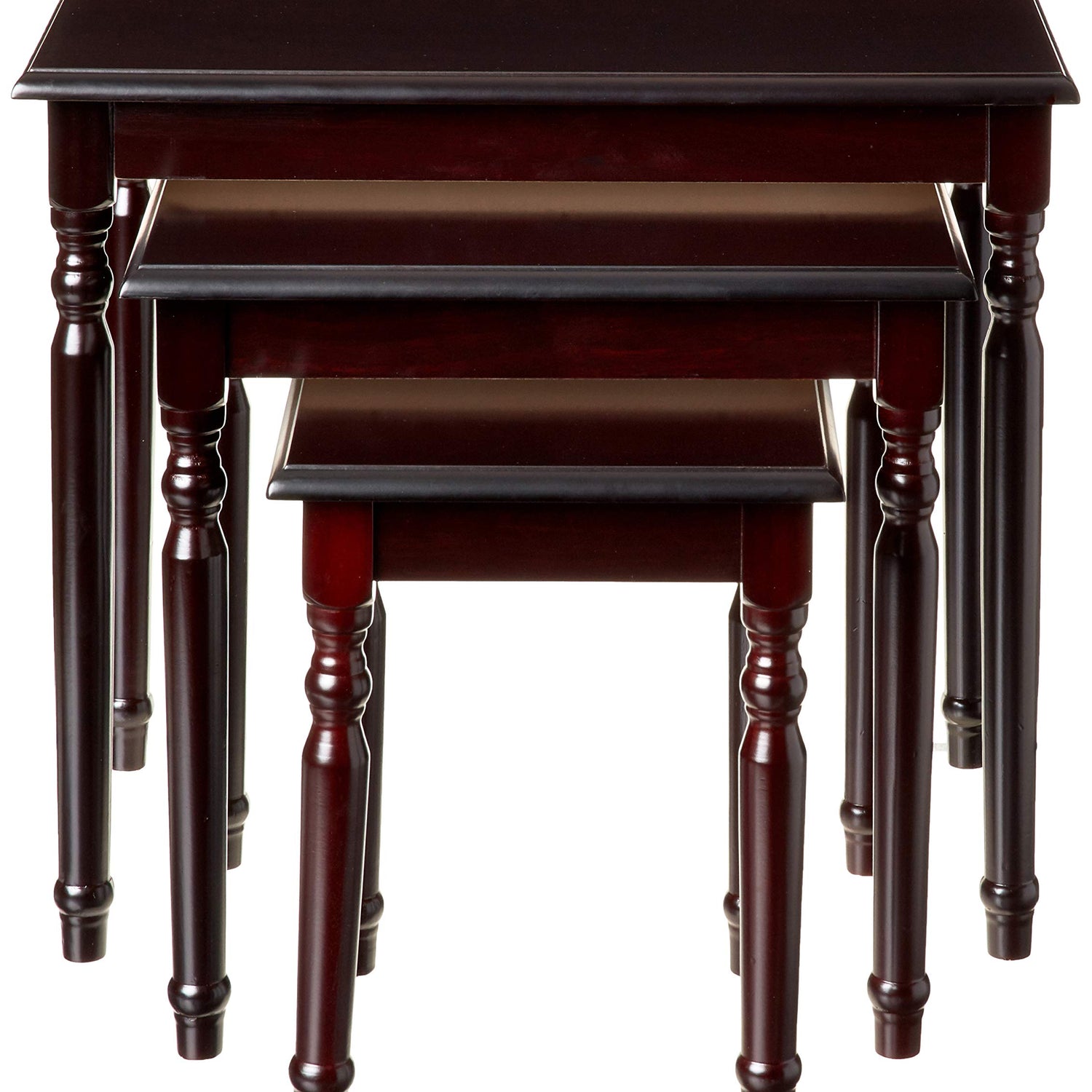 Details: These tables stacks compactly into a small space when stored but quickly arrays to nearly seven square feet of additional serving space when needed. All solid wood construction means they are built to hold up and meant to be used. All three tables can be arranged side by side to function as a compact coffee table or used to hold coasters and servings trays when stacked.