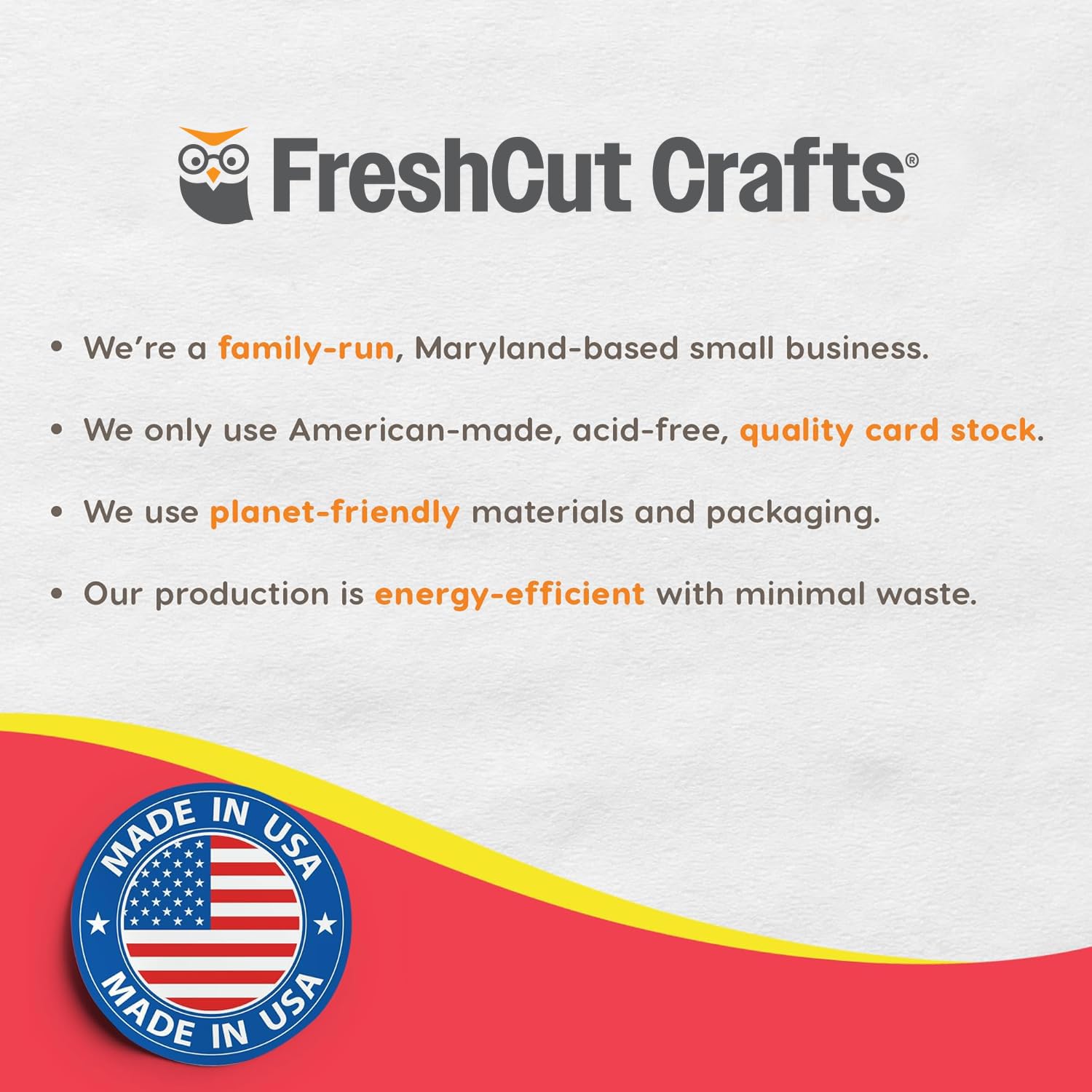 - FEEL-GOOD CRAFTING: At FreshCut Crafts, we're all about crafting with a conscience. Our products are not only about creativity but also about making a positive impact. Proudly family-made in the USA, we use high-quality, acid-free American-made paper that's perfect for preserving memories and creating lasting keepsakes. Our energy-efficient production processes are designed to minimize waste, ensuring that we leave a smaller footprint on the planet.