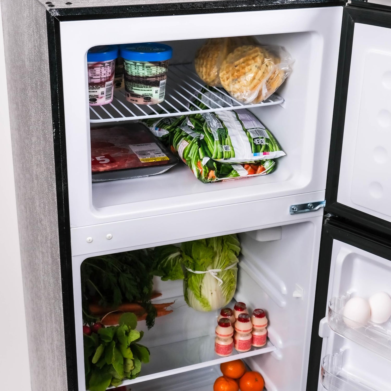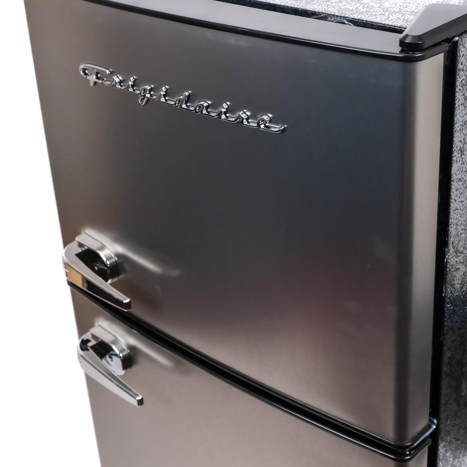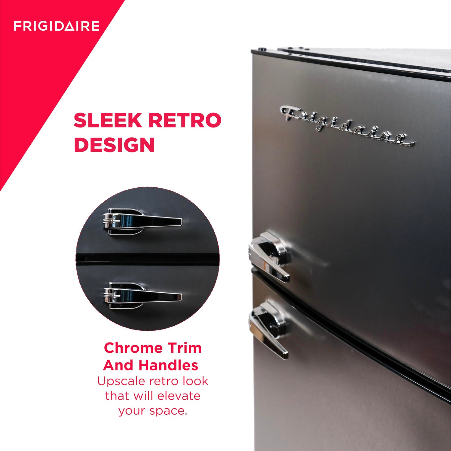 - SLEEK DESIGN: Featuring a sleek and durable platinum design with chrome trim and handles, this small fridge freezer adds an upscale retro look that will elevate your space.