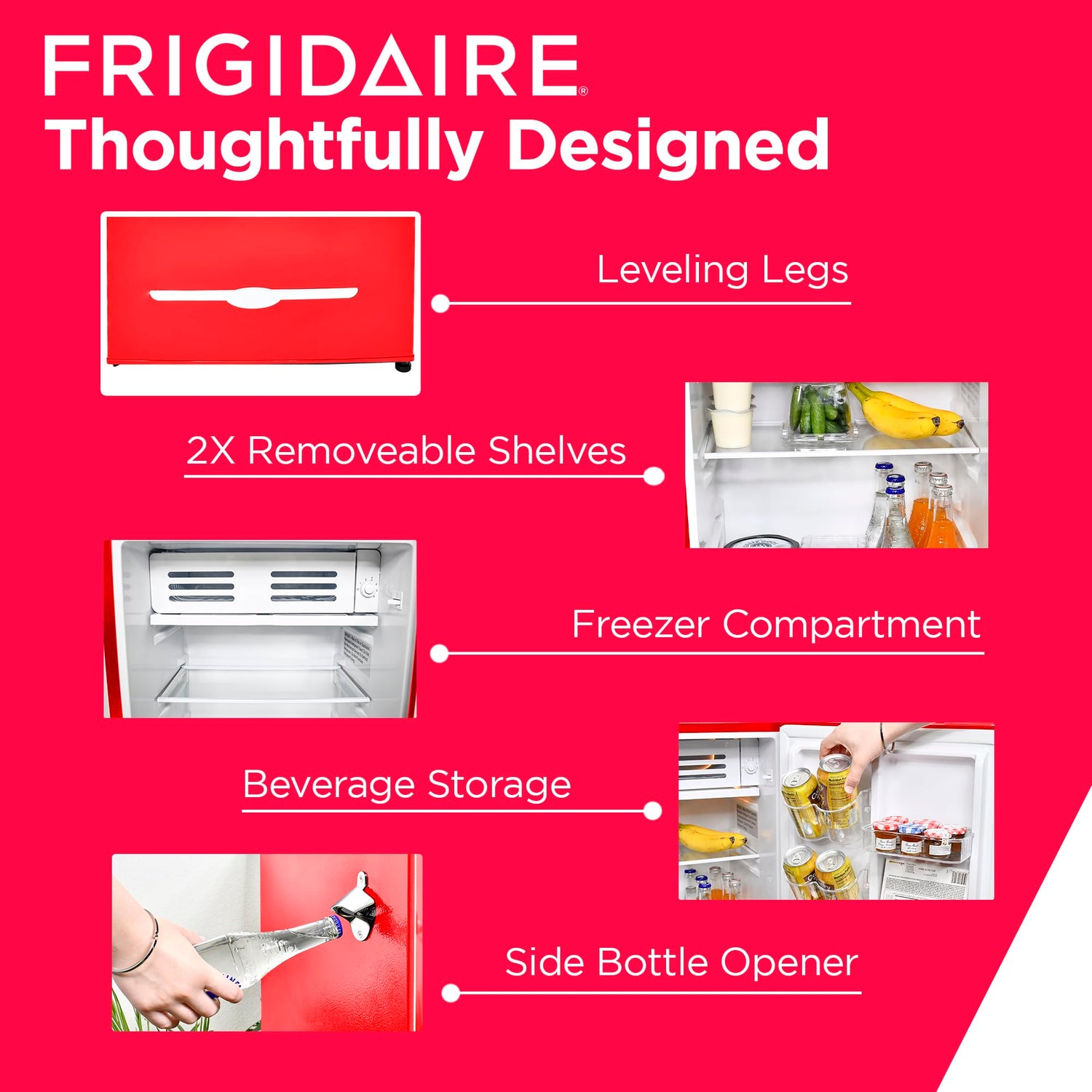 - PRACTICAL STYLE: Perfect for entertaining, this small retro refrigerator comes with a built-in bottle opener for quick access to your favorite beverages. The easy-open pull handle adds to the retro vibe, reminiscent of classic designs from the past.