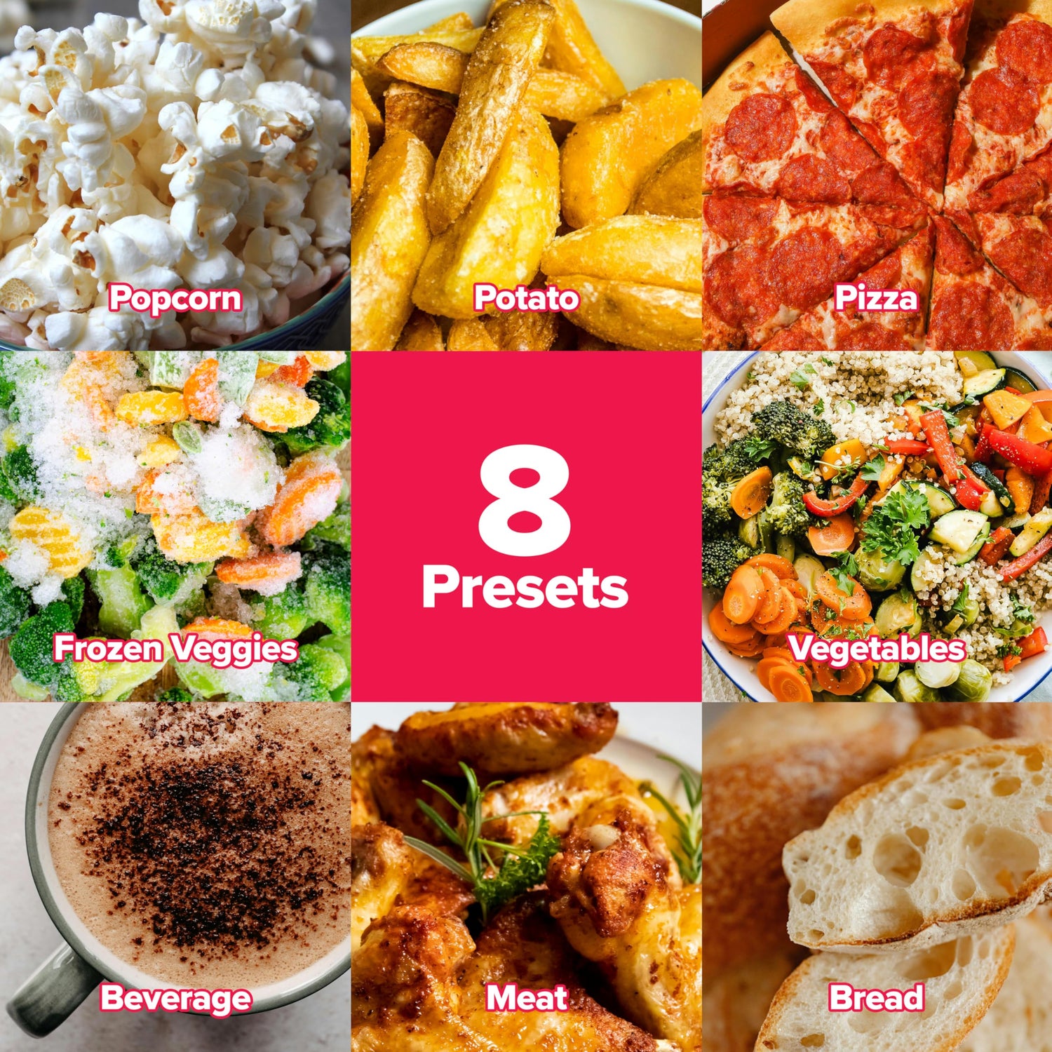 - POWERFUL: Microwave 1000-Watt power output. Settings, clock, kitchen timer, Child safety lock, Easy auto-cook functions: Popcorn, Potato, Pizza, Frozen Veggie, Beverage, Reheat