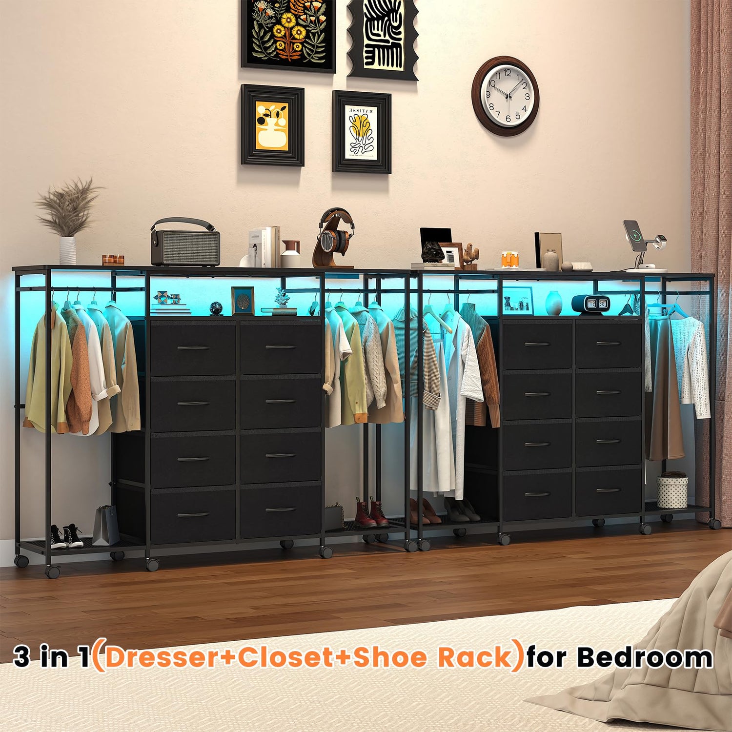 - Integrated Design: Combining a dresser and clothes rack, this unit features a clothes rack for hanging daily outfits and a bottom board for bags. The adjacent 8 drawers offer ample space for 120-150 socks, 70-80 coats, or 80-100 jeans, eliminating the need for multiple pieces of furniture.
